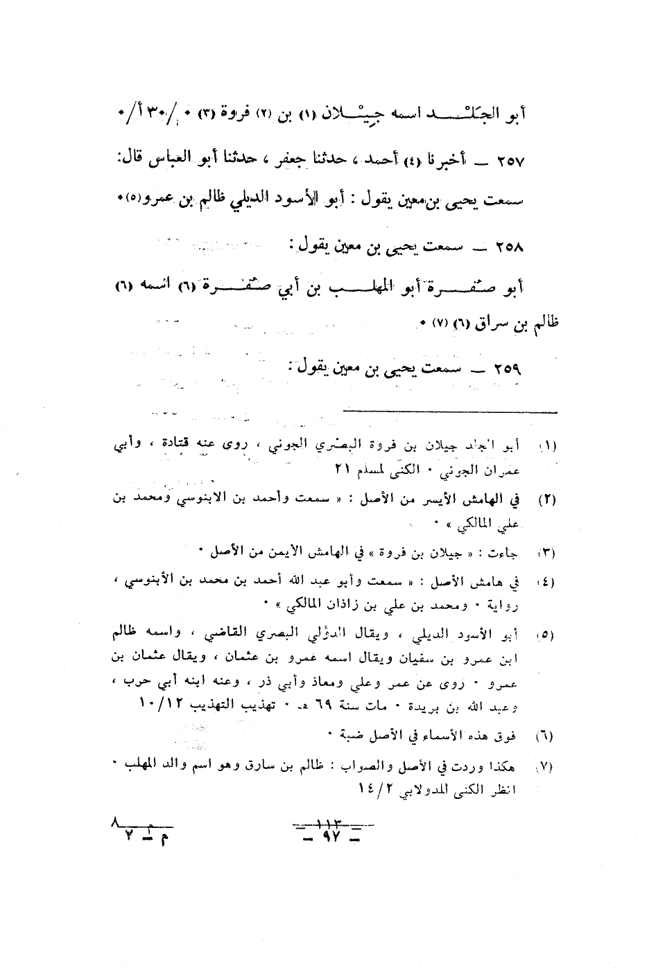 ابو الجلد اسمه جيلان بن فروة اخبرنا احمد حدثنا جعفر حدثنا ابو العباس قال سمعت يحيى بن معين يقول ابو الاسود الديلى ظالم بن عمرو سمعت يحيى بن معين يقول ابو صفرة ابو المهلب بن ابى صفرة اسمه ظالم بن سراق سمعت يحيى بن معين يقول
