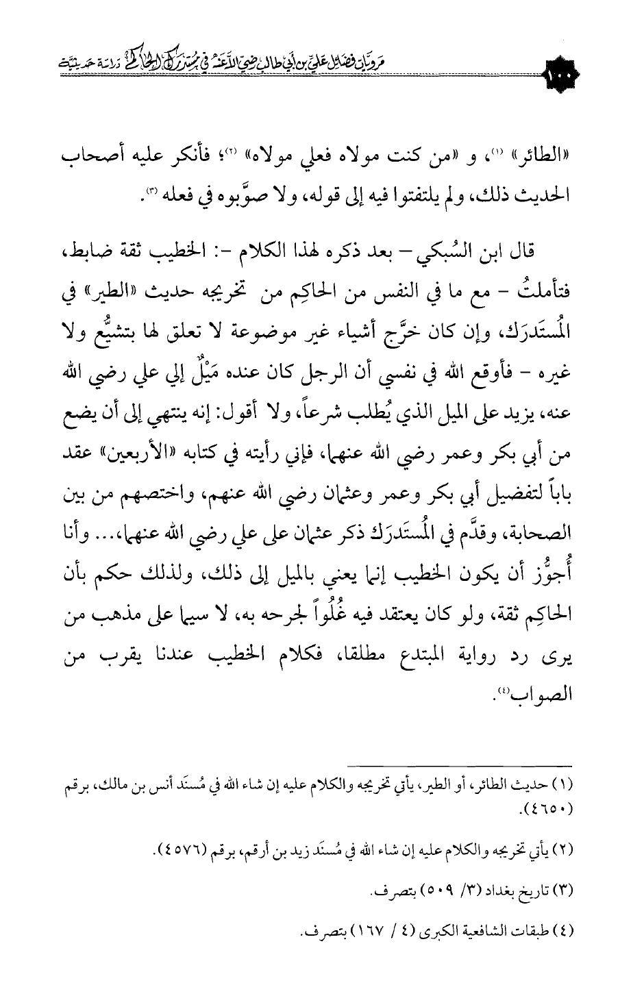 «الطائر» (¬١)، و «من كنت مولاه فعلى مولاه» (¬٢)؛ فأنكر عليه أصحاب الحديث ذلك، ولم يلتفتوا فيه إلى قوله، ولا صوَّبوه في فعله» (¬٣).