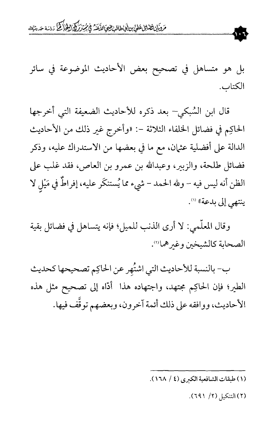 قال ابن السُبكي- بعد ذكره للأحاديث الضعيفة التي أخرجها الحاكِم في فضائل الخلفاء الثلاثة -: «وأخرج غير ذلك من الأحاديث الدالة على أفضلية عثمان، مع ما في بعضها من الاستدراك عليه، وذكر فضائل طلحة، والزبير، وعبدالله بن عمرو بن العاص، فقد غلب على الظن أنه ليس فيه - ولله الحمد - شيء مما يُستنكَر عليه، إفراطٌ في مَيْلٍ لا ينتهي إلى بدعة» (¬١).