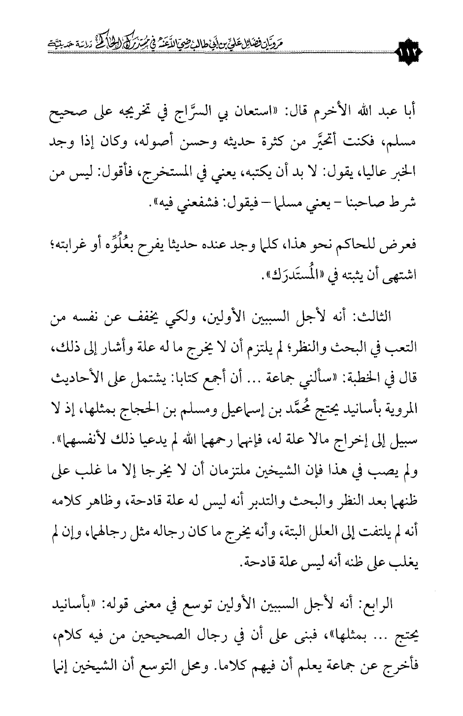 الثالث: أنه لأجل السببين الأولين، ولكي يخفف عن نفسه من التعب في البحث والنظر؛ لم يلتزم أن لا يخرج ما له علة وأشار إلى ذلك، قال في الخطبة: «سألني جماعة ... أن أجمع كتابا: يشتمل على الأحاديث المروية بأسانيد يحتج مُحمَّد بن إسماعيل ومسلم بن الحجاج بمثلها، إذ لا سبيل إلى إخراج مالا علة له، فإنهما رحمهما الله لم يدعيا ذلك لأنفسهما». ولم يصب في هذا فإن الشيخين ملتزمان أن لا يخرجا إلا ما غلب على ظنهما بعد النظر والبحث والتدبر أنه ليس له علة قادحة، وظاهر كلامه أنه لم يلتفت إلى العلل البتة، وأنه يخرج ما كان رجاله مثل رجالهما، وإن لم يغلب على ظنه أنه ليس علة قادحة.