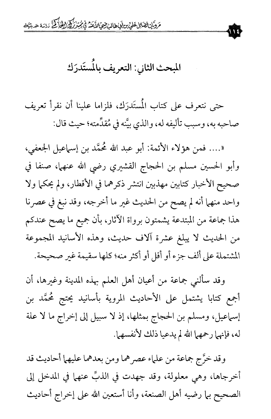 « .... ، فمن هؤلاء الأئمة: أبو عبدالله مُحمَّد بن إسماعيل الجعفي، وأبو الحسين مسلم بن الحجاج القشيري رضي الله عنهما، صنفا في صحيح الأخبار كتابين مهذبين انتشر ذكرهما في الأقطار، ولم يحكما ولا واحد منهما أنه لم يصح من الحديث غير ما أخرجه، وقد نبغ في عصرنا هذا جماعة من المبتدعة يشمتون برواة الآثار، بأن جميع ما يصح عندكم من الحديث لا يبلغ عشرة آلاف حديث، وهذه الأسانيد المجموعة المشتملة على ألف جزء أو أقل أو أكثر منه؛ كلها سقيمة غير صحيحة.