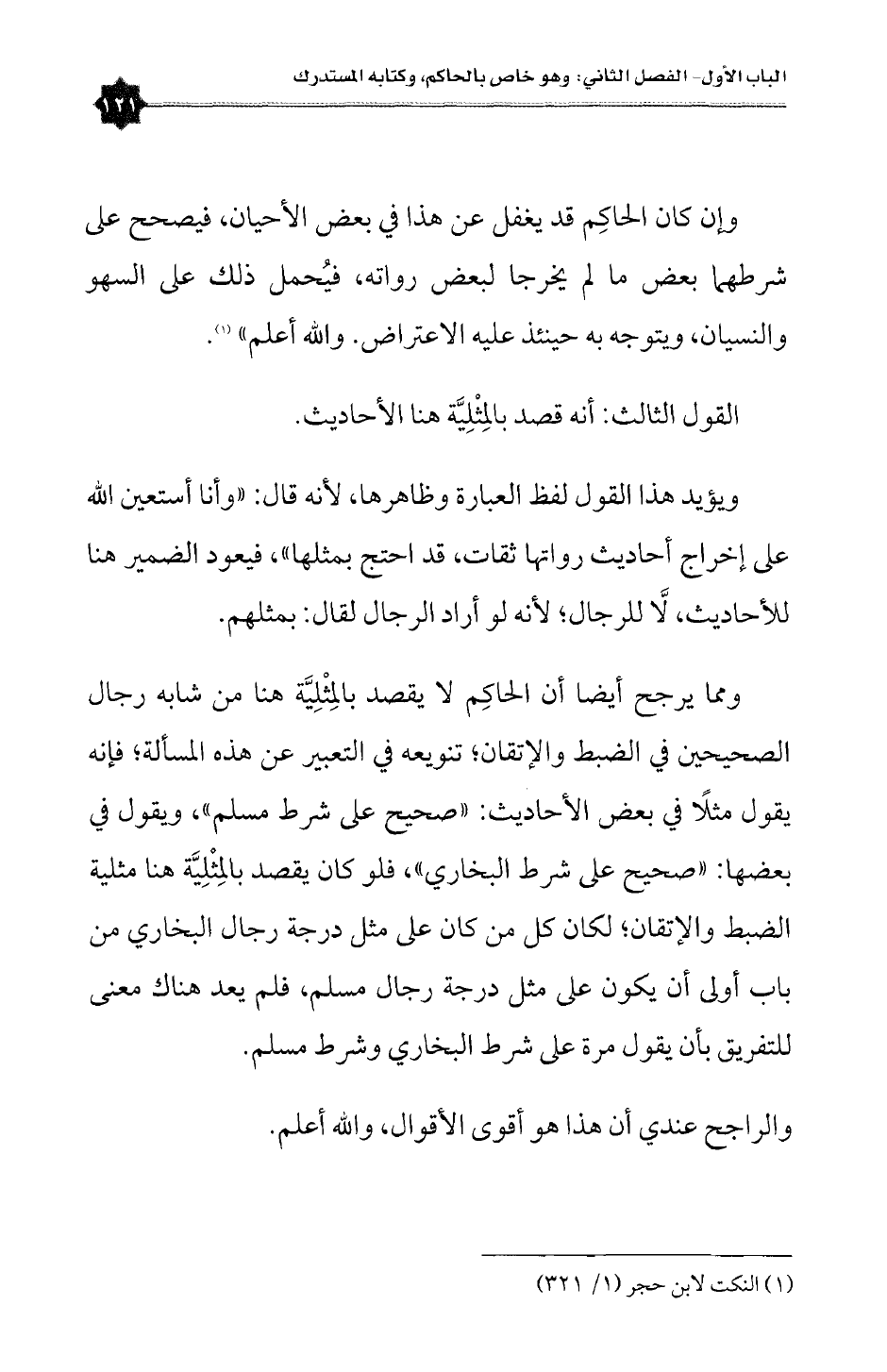 ويؤيد هذا القول لفظ العبارة وظاهرها، لأنه قال: «وأنا أستعين الله على إخراج أحاديث رواتها ثقات، قد احتج بمثلها»، فيعود الضمير هنا للأحاديث، لَّا للرجال؛ لأنه لو أراد الرجال لقال: بمثلهم.
