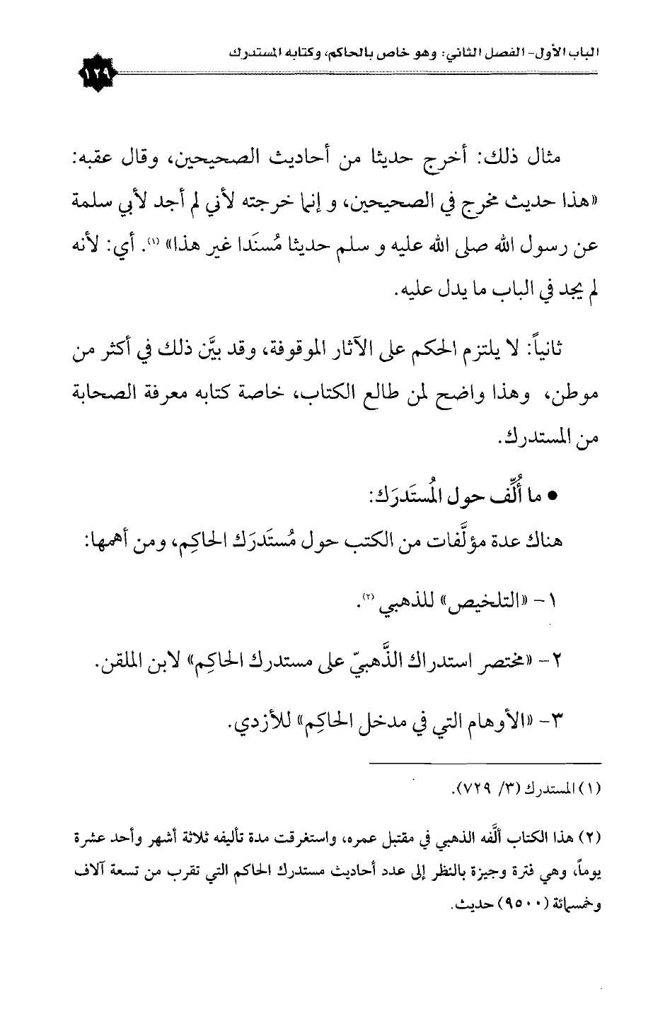 (¬٢) هذا الكتاب ألَّفه الذهبي في مقتبل عمره، واستغرقت مدة تأليفه ثلاثة أشهر وأحد عشرة يوماً، وهي فترة وجيزة بالنظر إلى عدد أحاديث مستدرك الحاكم التي تقرب من تسعة آلاف وخمسمائة (٩٥٠٠) حديث.