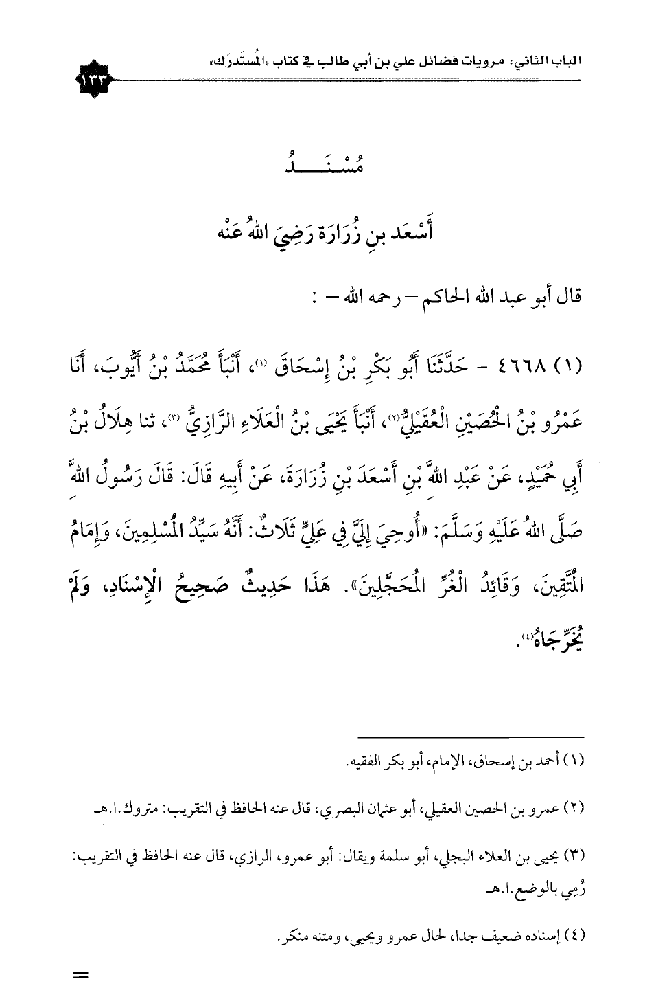 (١) ٤٦٦٨ - حَدَّثَنَا أَبُو بَكْرِ بْنُ إِسْحَاقَ (¬١)، أَنْبَأَ مُحَمَّدُ بْنُ أَيُّوبَ، أَنَا عَمْرُو بْنُ الْحُصَيْنِ الْعُقَيْلِيُّ (¬٢)، أَنْبَأَ يَحْيَى بْنُ الْعَلَاءِ الرَّازِيُّ (¬٣)، ثنا هِلَالُ بْنُ أَبِي حُمَيْدٍ، عَنْ عَبْدِاللَّهِ بْنِ أَسْعَدَ بْنِ زُرَارَةَ، عَنْ أَبِيهِ قَالَ: قَالَ رَسُولُ اللَّهِ صَلَّى اللهُ عَلَيْهِ وَسَلَّمَ: «أُوحِيَ إِلَيَّ فِي عَلِيٍّ ثَلَاثٍ: أَنَّهُ سَيِّدُ الْمُسْلِمِينَ، وَإِمَامُ الْمُتَّقِينَ، وَقَائِدُ الْغُرِّ الُمحَجَّلِينَ» (¬٤).