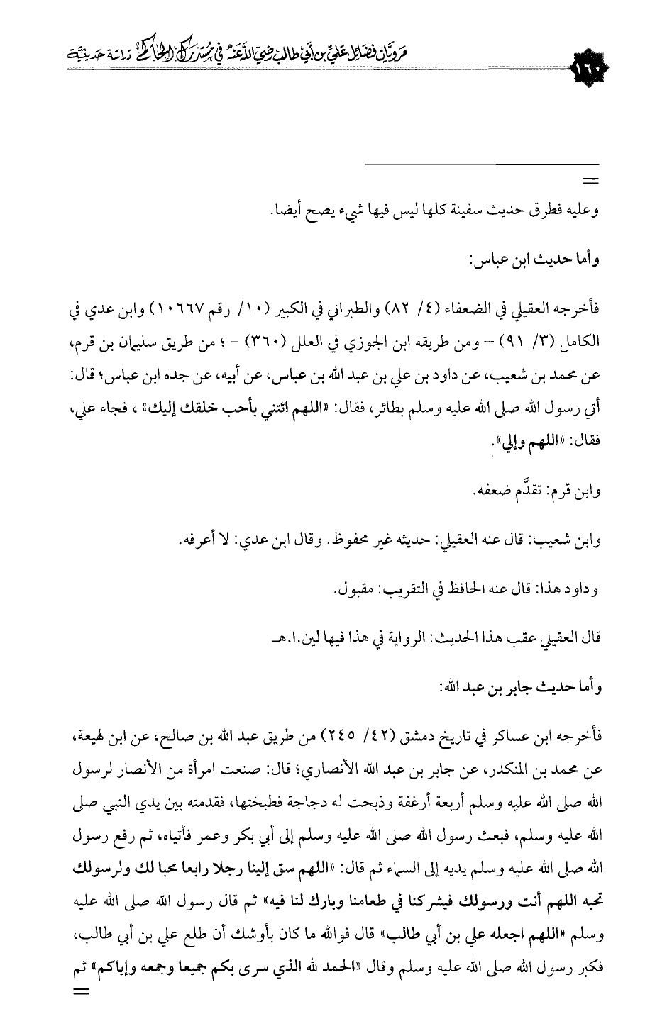 فأخرجه ابن عساكر في تاريخ دمشق (٤٢/ ٢٤٥) من طريق عبدالله بن صالح، عن ابن لهيعة، عن محمد بن المنكدر، عن جابر بن عبدالله الأنصاري؛ قال: صنعت امرأة من الأنصار لرسول الله صلى الله عليه وسلم أربعة أرغفة وذبحت له دجاجة فطبختها، فقدمته بين يدي النبي صلى الله عليه وسلم، فبعث رسول الله صلى الله عليه وسلم إلى أبي بكر وعمر فأتياه، ثم رفع رسول الله صلى الله عليه وسلم يديه إلى السماء ثم قال: «اللهم سق إلينا رجلا رابعا محبا لك ولرسولك تحبه اللهم أنت ورسولك فيشركنا في طعامنا وبارك لنا فيه» ثم قال رسول الله صلى الله عليه وسلم «اللهم اجعله علي بن أبي طالب» قال فوالله ما كان بأوشك أن طلع علي بن أبي طالب، فكبر رسول الله صلى الله عليه وسلم وقال «الحمد لله الذي سرى بكم جميعا وجمعه وإياكم» ثم =