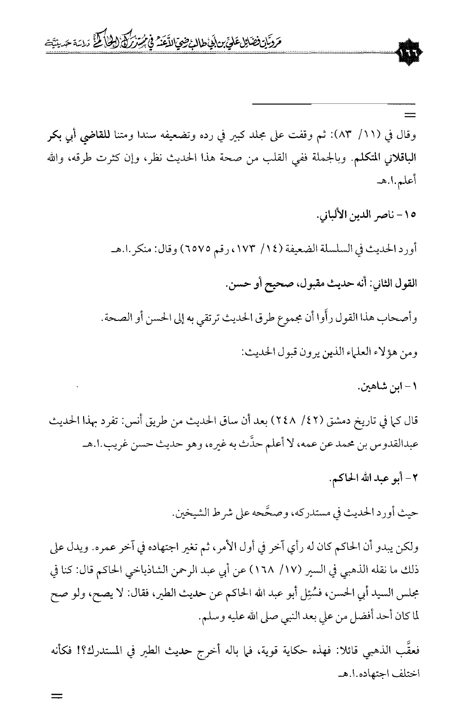 ولكن يبدو أن الحاكم كان له رأي آخر في أول الأمر، ثم تغير اجتهاده في آخر عمره. ويدل على ذلك ما نقله الذهبي في السير (١٧/ ١٦٨) عن أبي عبدالرحمن الشاذياخي الحاكم قال: كنا في مجلس السيد أبي الحسن، فسُئِل أبو عبدالله الحاكم عن حديث الطير، فقال: لا يصح، ولو صح لما كان أحد أفضل من علي بعد النبي صلى الله عليه وسلم.