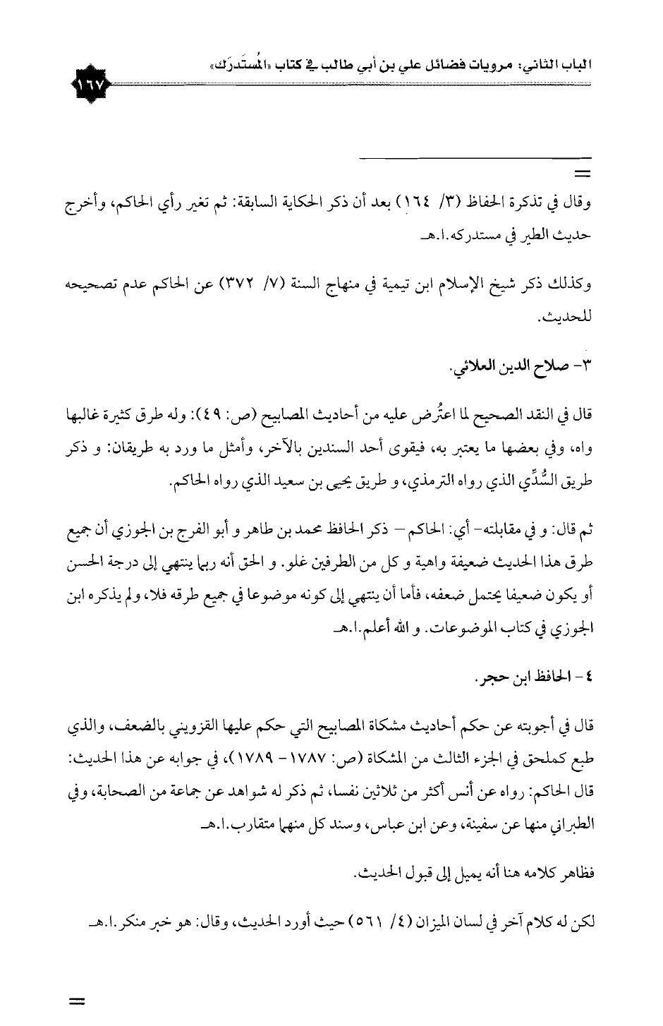 = وقال في تذكرة الحفاظ (٣/ ١٦٤) بعد أن ذكر الحكاية السابقة: ثم تغير رأي الحاكم، وأخرج حديث الطير في مستدركه. ا. هـ