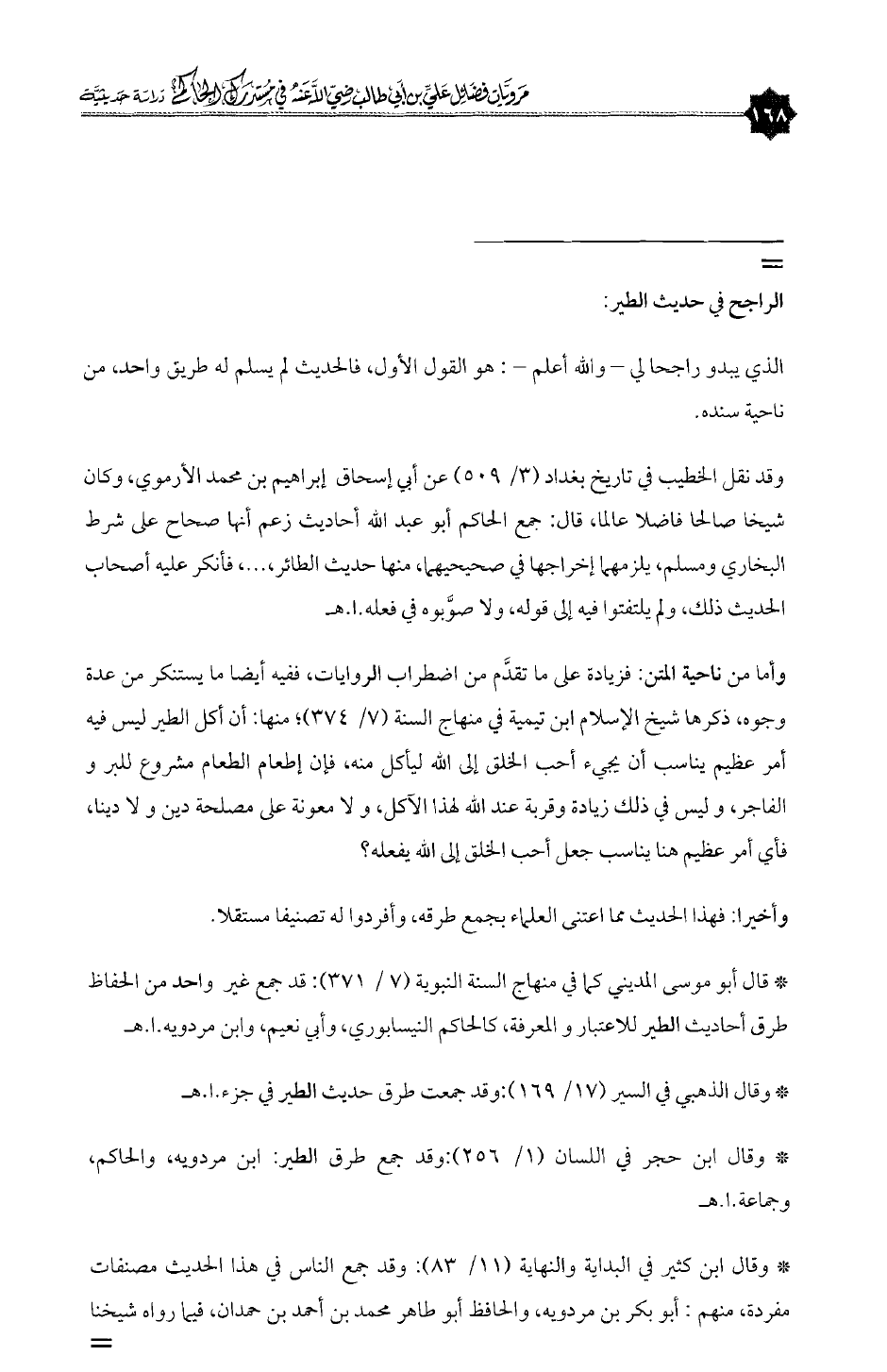 * قال أبو موسى المديني كما في منهاج السنة النبوية (٧/ ٣٧١): قد جمع غير واحد من الحفاظ طرق أحاديث الطير للاعتبار و المعرفة، كالحاكم النيسابوري، وأبي نعيم، وابن مردويه. ا. هـ