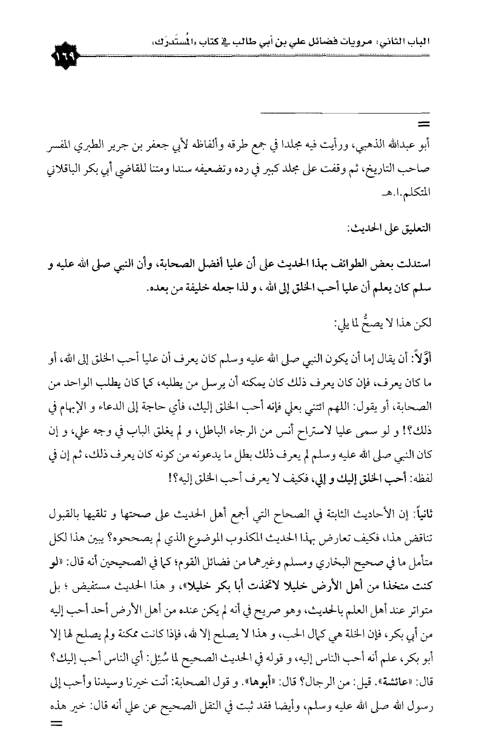 = = أبو عبدالله الذهبي، ورأيت فيه مجلدا في جمع طرقه وألفاظه لأبي جعفر بن جرير الطبري المفسر صاحب التاريخ، ثم وقفت على مجلد كبير في رده وتضعيفه سندا ومتنا للقاضي أبي بكر الباقلاني المتكلم. ا. هـ