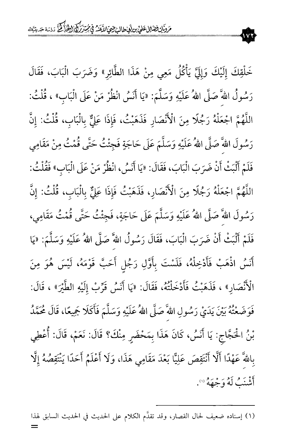 خَلْقِكَ إِلَيْكَ وَإِلَيَّ يَأْكُلُ مَعِي مِنْ هَذَا الطَّائِرِ» وَضَرَبَ الْبَابَ، فَقَالَ رَسُولُ اللَّهِ صَلَّى اللهُ عَلَيْهِ وَسَلَّمَ: «يَا أَنَسُ انْظُرْ مَنْ عَلَى الْبَابِ»، قُلْتُ: اللَّهُمَّ اجْعَلْهُ رَجُلًا مِنَ الْأَنْصَارِ فَذَهَبْتُ، فَإِذَا عَلِيٌّ بِالْبَابِ، قُلْتُ: إِنَّ رَسُولَ اللَّهِ صَلَّى اللهُ عَلَيْهِ وَسَلَّمَ عَلَى حَاجَةٍ فَجِئْتُ حَتَّى قُمْتُ مِنْ مَقَامِي فَلَمْ أَلْبَثْ أَنْ ضَرَبَ الْبَابَ، فَقَالَ: «يَا أَنَسُ، انْظُرْ مَنْ عَلَى الْبَابِ» فَقُلْتُ: اللَّهُمَّ اجْعَلْهُ رَجُلًا مِنَ الْأَنْصَارِ، فَذَهَبْتُ فَإِذَا عَلِيٌّ بِالْبَابِ، قُلْتُ: إِنَّ رَسُولَ اللَّهِ صَلَّى اللهُ عَلَيْهِ وَسَلَّمَ عَلَى حَاجَةٍ، فَجِئْتُ حَتَّى قُمْتُ مَقَامِي، فَلَمْ أَلْبَثْ أَنْ ضَرَبَ الْبَابَ، فَقَالَ رَسُولُ اللَّهِ صَلَّى اللهُ عَلَيْهِ وَسَلَّمَ: «يَا أَنَسُ اذْهَبْ فَأَدْخِلْهُ، فَلَسْتَ بِأَوَّلِ رَجُلٍ أَحَبَّ قَوْمَهُ لَيْسَ هُوَ مِنَ الْأَنْصَارِ»، فَذَهَبْتُ فَأَدْخَلْتُهُ، فَقَالَ: «يَا أَنَسُ قَرِّبْ إِلَيْهِ الطَّيْرَ»، قَالَ: فَوَضَعْتُهُ بَيْنَ يَدَيْ رَسُولِ اللَّهِ صَلَّى اللهُ عَلَيْهِ وَسَلَّمَ فَأَكَلَا جَمِيعًا، قَالَ مُحَمَّدُ بْنُ الْحَجَّاجِ: يَا أَنَسُ، كَانَ هَذَا بِمَحْضَرٍ مِنْكَ؟ قَالَ: نَعَمْ، قَالَ: أُعْطِي بِاللَّهِ عَهْدًا أَلَّا أَنْتَقِصَ عَلِيًّا بَعْدَ مَقَامِي هَذَا، وَلَا أَعْلَمُ أَحَدًا يَنْتَقِصُهُ إِلَّا أَشْنَبَ لَهُ وَجْهَهُ (¬١).