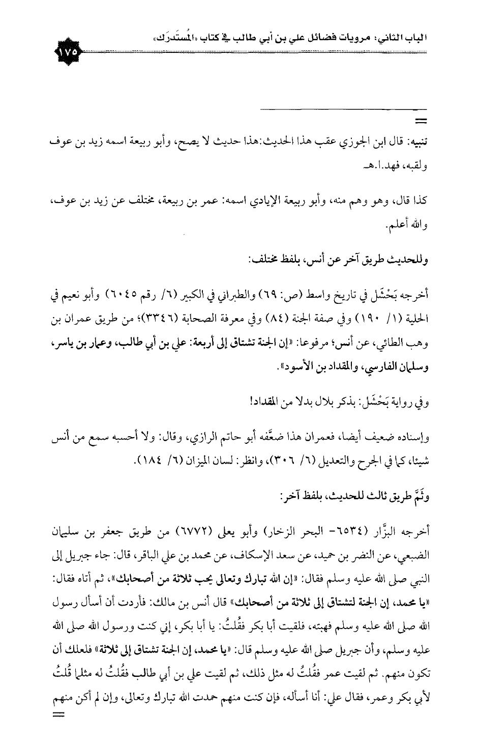 أخرجه بَحْشَل في تاريخ واسط (ص: ٦٩) والطبراني في الكبير (٦/ رقم ٦٠٤٥) وأبو نعيم في الحلية (١/ ١٩٠) وفي صفة الجنة (٨٤) وفي معرفة الصحابة (٣٣٤٦)؛ من طريق عمران بن وهب الطائي، عن أنس؛ مرفوعا: «إن الجنة تشتاق إلى أربعة: علي بن أبي طالب، وعمار بن ياسر، وسلمان الفارسي، والمقداد بن الأسود».