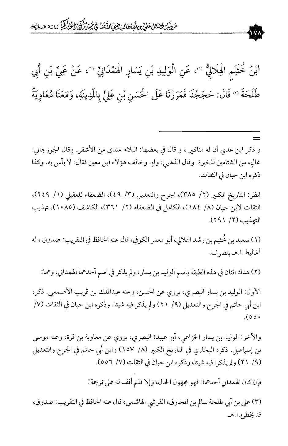 بْنُ خُثَيْمٍ الْهِلَالِيُّ (¬١)، عَنِ الْوَلِيدِ بْنِ يَسَارٍ الْهَمْدَانِيِّ (¬٢)، عَنْ عَلِيِّ بْنِ أَبِي طَلْحَةَ (¬٣) قَالَ: حَجَجْنَا فَمَرَرْنَا عَلَى الْحَسَنِ بْنِ عَلِيٍّ بِالْمَدِينَةِ، وَمَعَنَا مُعَاوِيَةُ