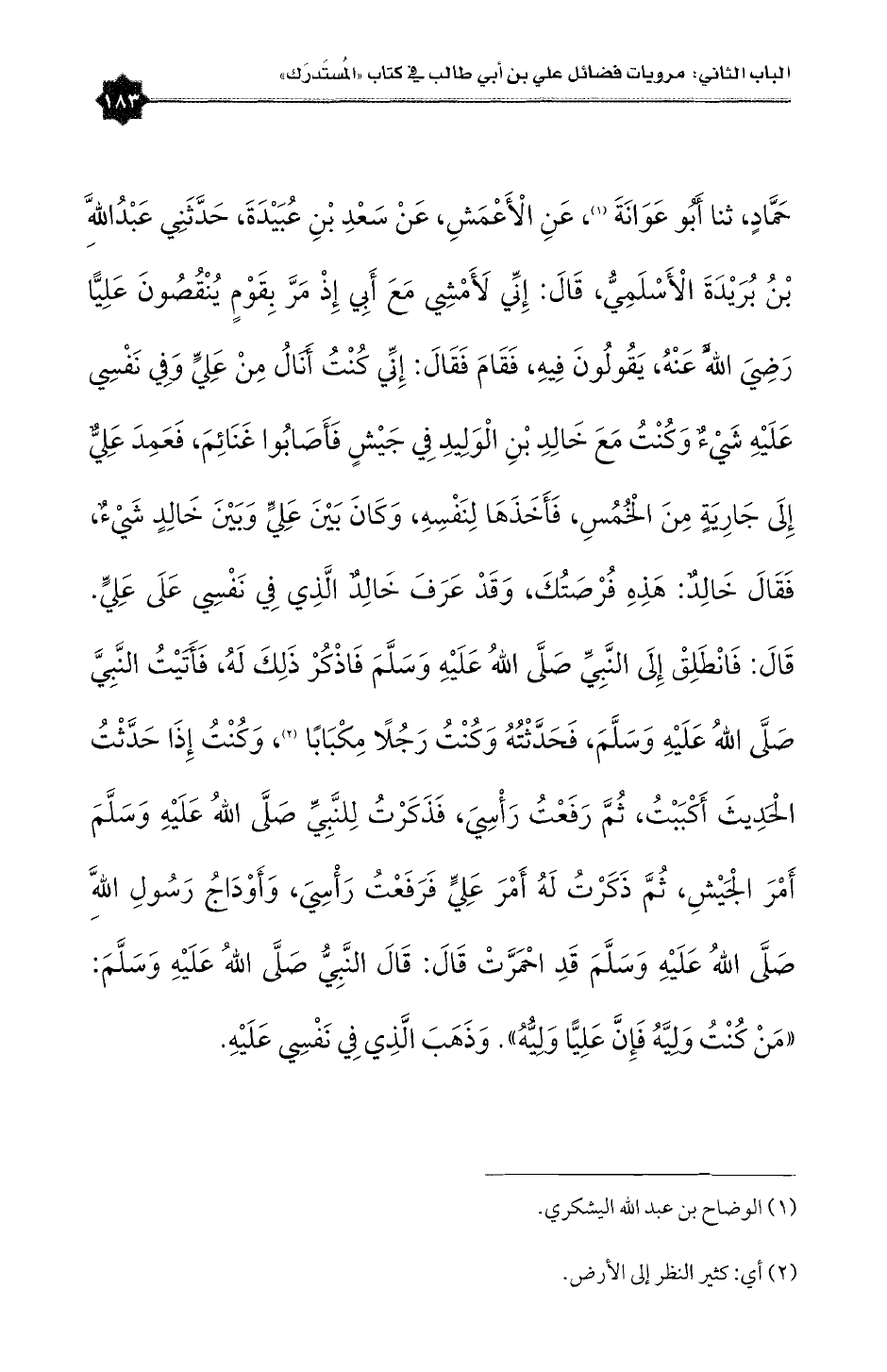 حَمَّادٍ، ثنا أَبُو عَوَانَةَ (¬١)، عَنِ الْأَعْمَشِ، عَنْ سَعْدِ بْنِ عُبَيْدَةَ، حَدَّثَنِي عَبْدُاللَّهِ بْنُ بُرَيْدَةَ الْأَسْلَمِيُّ، قَالَ: إِنِّي لَأَمْشِي مَعَ أَبِي إِذْ مَرَّ بِقَوْمٍ يُنْقُصُونَ عَلِيًّا رَضِيَ اللَّهُ عَنْهُ، يَقُولُونَ فِيهِ، فَقَامَ فَقَالَ: إِنِّي كُنْتُ أَنَالُ مِنْ عَلِيٍّ وَفِي نَفْسِي عَلَيْهِ شَيْءٌ وَكُنْتُ مَعَ خَالِدِ بْنِ الْوَلِيدِ فِي جَيْشٍ فَأَصَابُوا غَنَائِمَ، فَعَمِدَ عَلِيٌّ إِلَى جَارِيَةٍ مِنَ الْخُمُسِ، فَأَخَذَهَا لِنَفْسِهِ، وَكَانَ بَيْنَ عَلِيٍّ وَبَيْنَ خَالِدٍ شَيْءٌ، فَقَالَ خَالِدٌ: هَذِهِ فُرْصَتُكَ، وَقَدْ عَرَفَ خَالِدٌ الَّذِي فِي نَفْسِي عَلَى عَلِيٍّ. قَالَ: فَانْطَلِقْ إِلَى النَّبِيِّ صَلَّى اللهُ عَلَيْهِ وَسَلَّمَ فَاذْكُرْ ذَلِكَ لَهُ، فَأَتَيْتُ النَّبِيَّ صَلَّى اللهُ عَلَيْهِ وَسَلَّمَ، فَحَدَّثْتُهُ وَكُنْتُ رَجُلًا مِكْبَابًا (¬٢)، وَكُنْتُ إِذَا حَدَّثْتُ الْحَدِيثَ أَكْبَبْتُ، ثُمَّ رَفَعْتُ رَأْسِيَ، فَذَكَرْتُ لِلنَّبِيِّ صَلَّى اللهُ عَلَيْهِ وَسَلَّمَ أَمْرَ الْجَيْشِ، ثُمَّ ذَكَرْتُ لَهُ أَمْرَ عَلِيٍّ فَرَفَعْتُ رَأْسِيَ، وَأَوْدَاجُ رَسُولِ اللَّهِ صَلَّى اللهُ عَلَيْهِ وَسَلَّمَ قَدِ احْمَرَّتْ قَالَ: قَالَ النَّبِيُّ صَلَّى اللهُ عَلَيْهِ وَسَلَّمَ: «مَنْ كُنْتُ وَلِيَّهُ فَإِنَّ عَلِيًّا وَلِيُّهُ». وَذَهَبَ الَّذِي فِي نَفْسِي عَلَيْهِ.