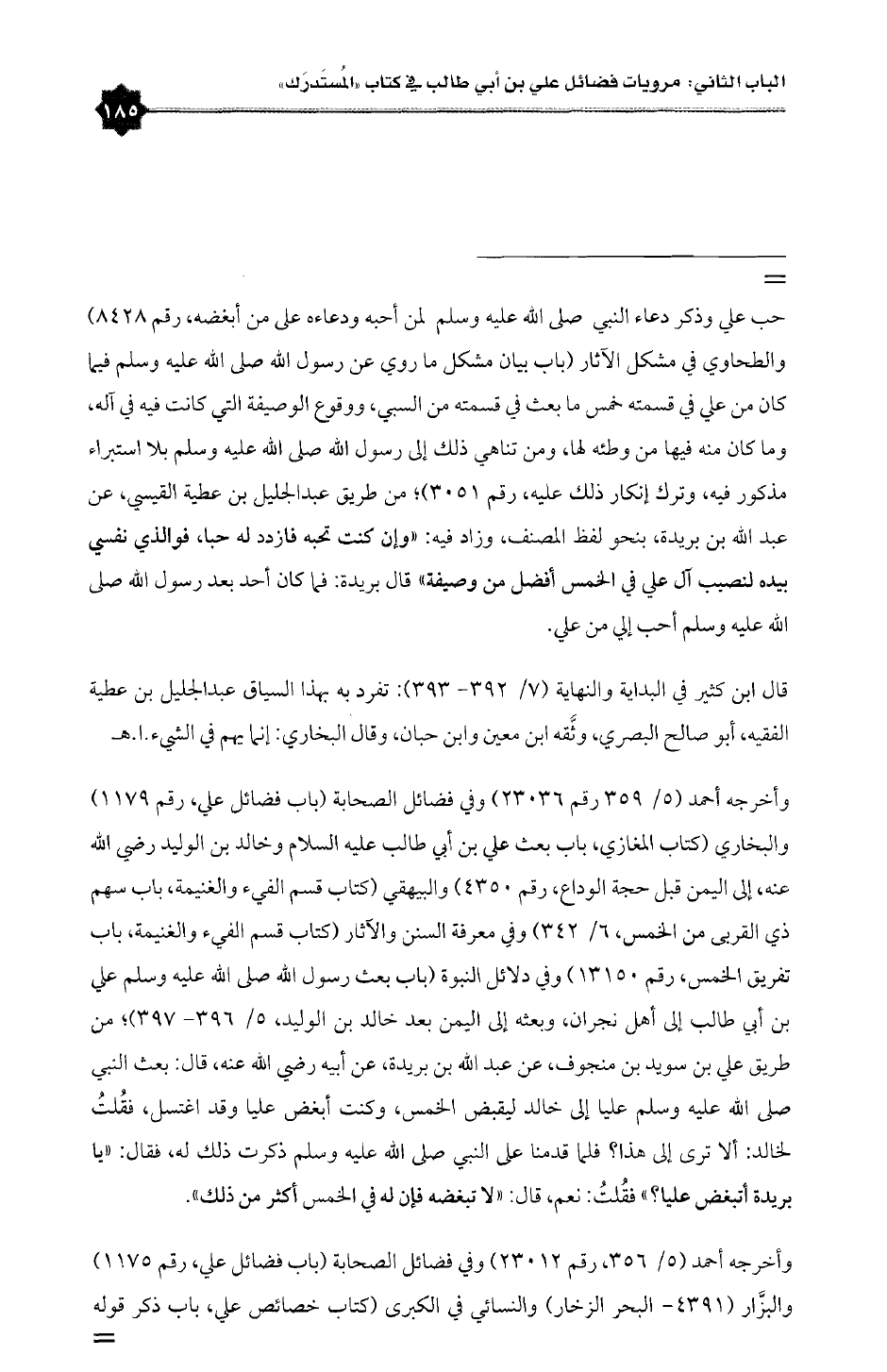 وأخرجه أحمد (٥/ ٣٥٩ رقم ٢٣٠٣٦) وفي فضائل الصحابة (باب فضائل علي، رقم ١١٧٩) والبخاري (كتاب المغازي، باب بعث علي بن أبي طالب عليه السلام وخالد بن الوليد رضي الله عنه، إلى اليمن قبل حجة الوداع، رقم ٤٣٥٠) والبيهقي (كتاب قسم الفيء والغنيمة، باب سهم ذي القربى من الخمس، ٦/ ٣٤٢) وفي معرفة السنن والآثار (كتاب قسم الفيء والغنيمة، باب تفريق الخمس، رقم ١٣١٥٠) وفي دلائل النبوة (باب بعث رسول الله صلى الله عليه وسلم علي بن أبي طالب إلى أهل نجران، وبعثه إلى اليمن بعد خالد بن الوليد، ٥/ ٣٩٦ - ٣٩٧)؛ من طريق علي بن سويد بن منجوف، عن عبدالله بن بريدة، عن أبيه رضي الله عنه، قال: بعث النبي صلى الله عليه وسلم عليا إلى خالد ليقبض الخمس، وكنت أبغض عليا وقد اغتسل، فقُلتُ لخالد: ألا ترى إلى هذا؟ فلما قدمنا على النبي صلى الله عليه وسلم ذكرت ذلك له، فقال: «يا بريدة أتبغض عليا؟» فقُلتُ: نعم، قال: «لا تبغضه فإن له في الخمس أكثر من ذلك».