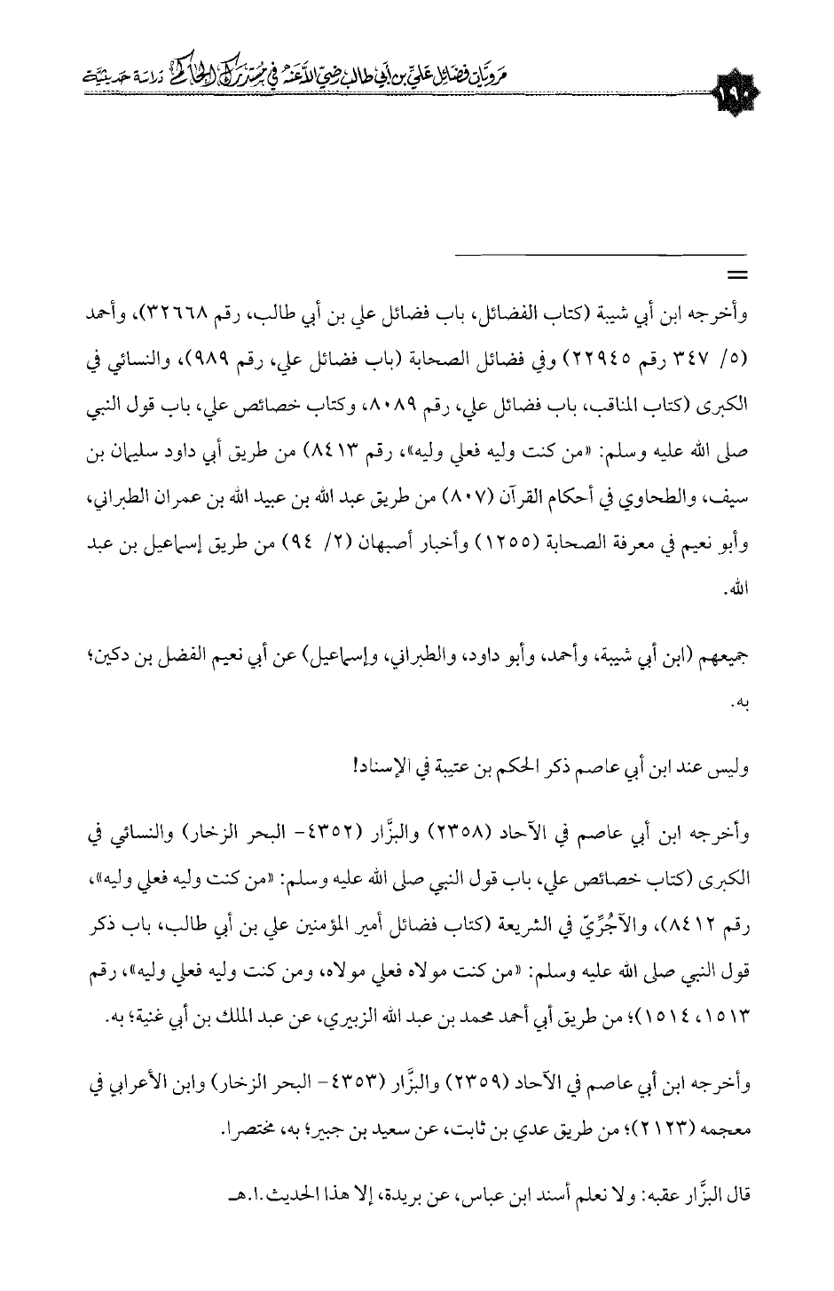 وأخرجه ابن أبي عاصم في الآحاد (٢٣٥٨) والبزَّار (٤٣٥٢ - البحر الزخار) والنسائي في الكبرى (كتاب خصائص علي، باب قول النبي صلى الله عليه وسلم: «من كنت وليه فعلي وليه»، رقم ٨٤١٢)، والآجُرِّيّ في الشريعة (كتاب فضائل أمير المؤمنين علي بن أبي طالب، باب ذكر قول النبي صلى الله عليه وسلم: «من كنت مولاه فعلي مولاه، ومن كنت وليه فعلي وليه»، رقم ١٥١٣، ١٥١٤)؛ من طريق أبي أحمد محمد بن عبدالله الزبيري، عن عبدالملك بن أبي غنية؛ به.