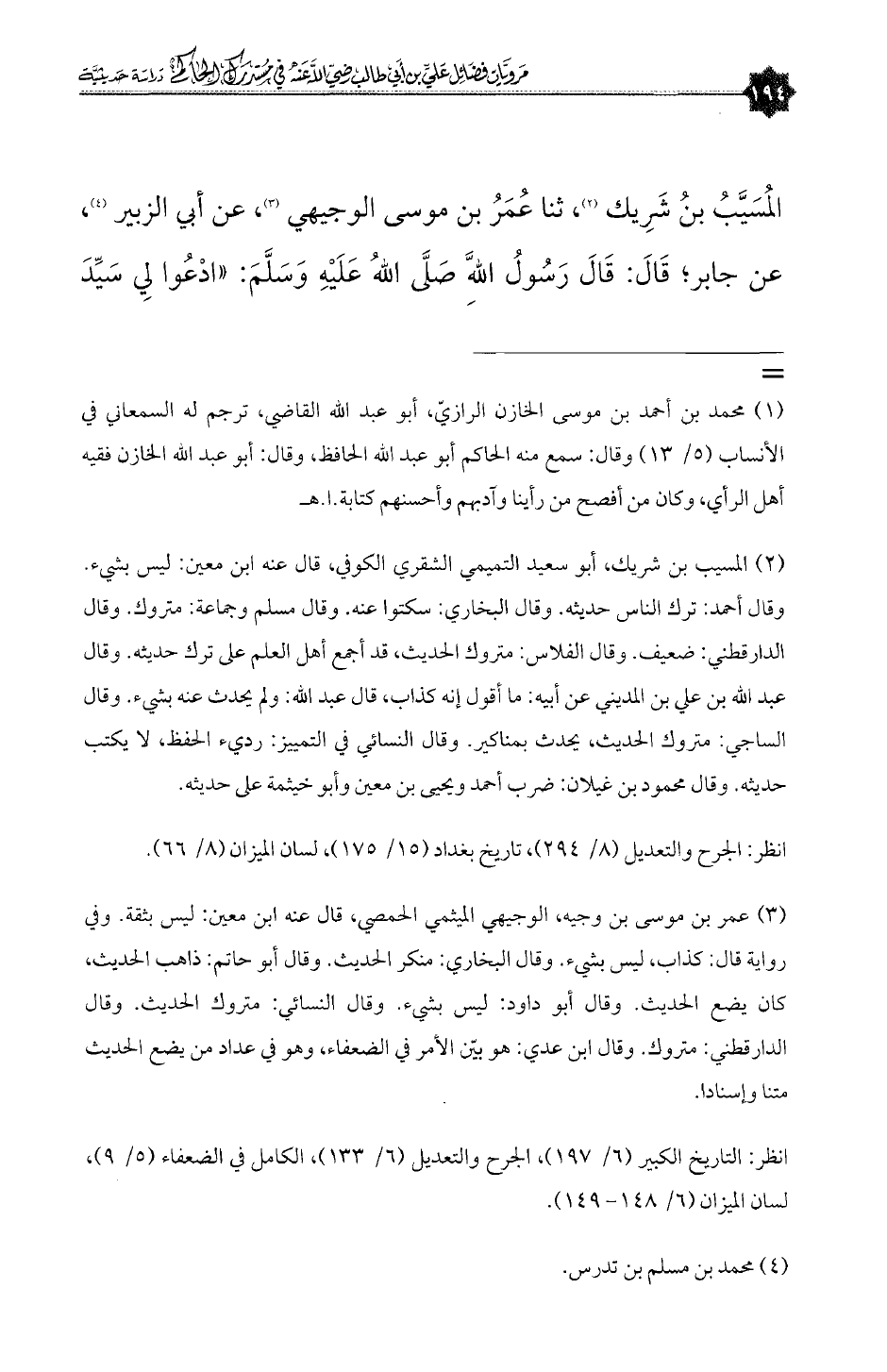 (¬١) المسيب بن شريك، أبو سعيد التميمي الشقري الكوفي، قال عنه ابن معين: ليس بشيء. وقال أحمد: ترك الناس حديثه. وقال البخاري: سكتوا عنه. وقال مسلم وجماعة: متروك. وقال الدارقطني: ضعيف. وقال الفلاس: متروك الحديث، قد أجمع أهل العلم على ترك حديثه. وقال عبدالله بن علي بن المديني عن أبيه: ما أقول أنه كذاب، قال عبدالله: ولم يحدث عنه بشيء. وقال الساجي: متروك الحديث، يحدث بمناكير. وقال النسائي في التمييز: رديء الحفظ، لا يكتب حديثه. وقال محمود بن غيلان: ضرب أحمد ويحيى بن معين وأبو خيثمة على حديثه.
