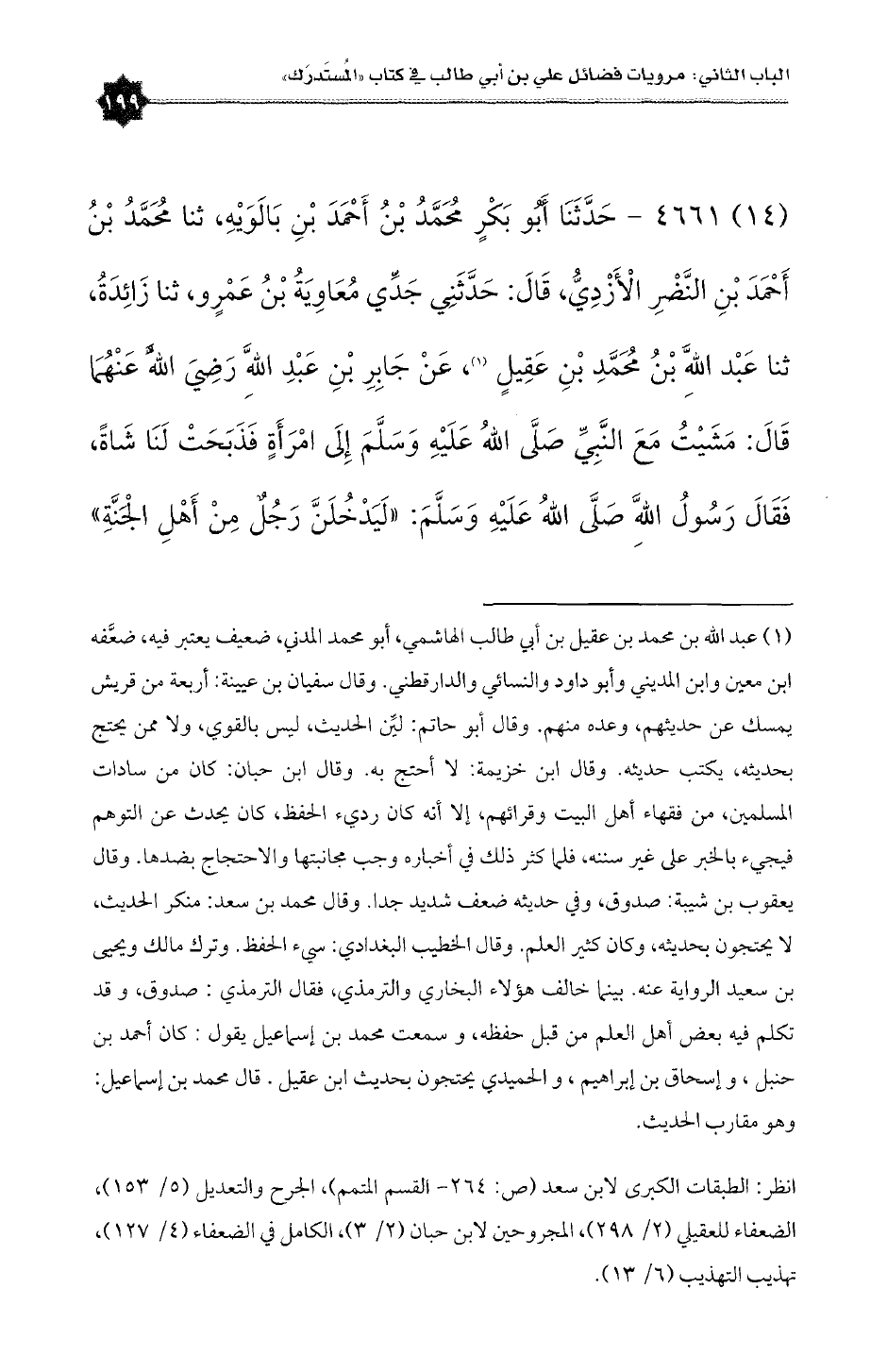 (١٤) ٤٦٦١ - حَدَّثَنَا أَبُو بَكْرٍ مُحَمَّدُ بْنُ أَحْمَدَ بْنِ بَالَوَيْهِ، ثنا مُحَمَّدُ بْنُ أَحْمَدَ بْنِ النَّضْرِ الْأَزْدِيُّ، قَالَ: حَدَّثَنِي جَدِّي مُعَاوِيَةُ بْنُ عَمْرٍو، ثنا زَائِدَةُ، ثنا عَبْدُاللَّهِ بْنُ مُحَمَّدِ بْنِ عَقِيلٍ (¬١)، عَنْ جَابِرِ بْنِ عَبْدِاللَّهِ رَضِيَ اللَّهُ عَنْهُمَا قَالَ: مَشَيْتُ مَعَ النَّبِيِّ صَلَّى اللهُ عَلَيْهِ وَسَلَّمَ إِلَى امْرَأَةٍ فَذَبَحَتْ لَنَا شَاةً، فَقَالَ رَسُولُ اللَّهِ صَلَّى اللهُ عَلَيْهِ وَسَلَّمَ: «لَيَدْخُلَنَّ رَجُلٌ مِنْ أَهْلِ الْجَنَّةِ»