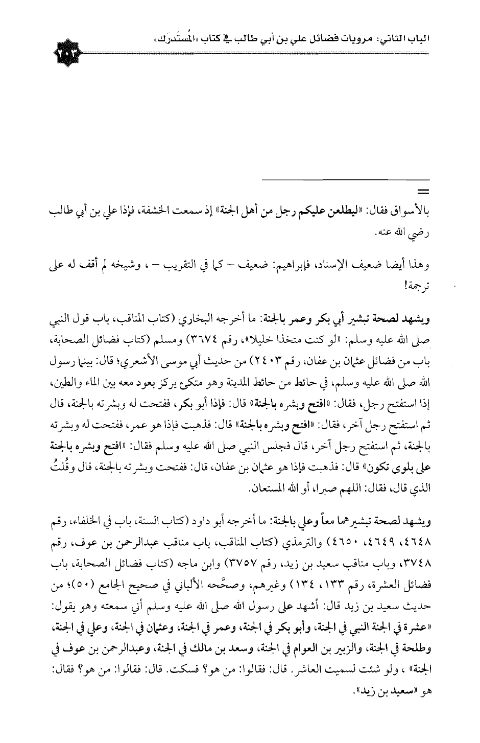 ويشهد لصحة تبشيرهما معاً وعلي بالجنة: ما أخرجه أبو داود (كتاب السنة، باب في الخلفاء، رقم ٤٦٤٨، ٤٦٤٩، ٤٦٥٠) والترمذي (كتاب المناقب، باب مناقب عبدالرحمن بن عوف، رقم ٣٧٤٨، وباب مناقب سعيد بن زيد، رقم ٣٧٥٧) وابن ماجه (كتاب فضائل الصحابة، باب فضائل العشرة، رقم ١٣٣، ١٣٤) وغيرهم، وصحَّحه الألباني في صحيح الجامع (٥٠)؛ من حديث سعيد بن زيد قال: أشهد على رسول الله صلى الله عليه وسلم أني سمعته وهو يقول: «عشرة في الجنة النبي في الجنة، وأبو بكر في الجنة، وعمر في الجنة، وعثمان في الجنة، وعلي في الجنة، وطلحة في الجنة، والزبير بن العوام في الجنة، وسعد بن مالك في الجنة، وعبدالرحمن بن عوف في الجنة»، ولو شئت لسميت العاشر. قال: فقالوا: من هو؟ فسكت. قال: فقالوا: من هو؟ فقال: هو «سعيد بن زيد».