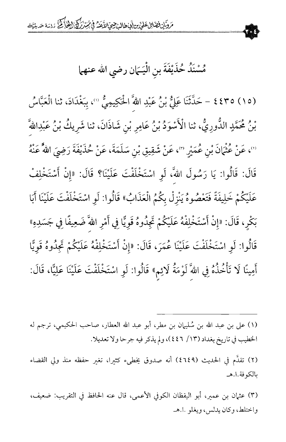 (١٥) ٤٤٣٥ - حَدَّثَنَا عَلِيُّ بْنُ عَبْدِاللَّهِ الْحَكِيمِيُّ (¬١)، بِبَغْدَادَ، ثنا الْعَبَّاسُ بْنُ مُحَمَّدٍ الدُّورِيُّ، ثنا الْأَسْوَدُ بْنُ عَامِرِ بْنِ شَاذَانَ، ثنا شَرِيكُ بْنُ عَبْدِاللَّهِ (¬٢)، عَنْ عُثْمَانَ بْنِ عُمَيْرٍ (¬٣)، عَنْ شَقِيقِ بْنِ سَلَمَةَ، عَنْ حُذَيْفَةَ رَضِيَ اللَّهُ عَنْهُ قَالَ: قَالُوا: يَا رَسُولَ اللَّهِ، لَوِ اسْتَخْلَفْتَ عَلَيْنَا؟ قَالَ: «إِنْ أَسْتَخْلِفْ عَلَيْكُمْ خَلِيفَةً فَتَعْصُوهُ يَنْزِلْ بِكُمُ الْعَذَابُ» قَالُوا: لَوِ اسْتَخْلَفْتَ عَلَيْنَا أَبَا بَكْرٍ، قَالَ: «إِنْ أَسْتَخْلِفْهُ عَلَيْكُمْ تَجِدُوهُ قَوِيًّا فِي أَمْرِ اللَّهِ ضَعِيفًا فِي جَسَدِهِ» قَالُوا: لَوِ اسْتَخْلَفْتَ عَلَيْنَا عُمَرَ، قَالَ: «إِنْ أَسْتَخْلِفْهُ عَلَيْكُمْ تَجِدُوهُ قَوِيًّا أَمِينًا لَا تَأْخُذُهُ فِي اللَّهِ لَوْمَةُ لَائِمٍ» قَالُوا: لَوِ اسْتَخْلَفْتَ عَلَيْنَا عَلِيًّا، قَالَ: