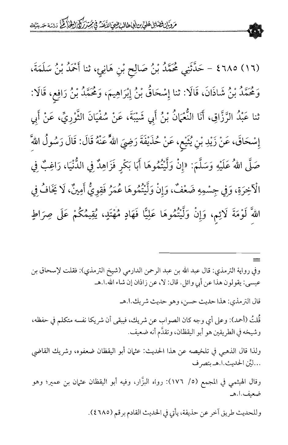 (١٦) ٤٦٨٥ - حَدَّثَنِي مُحَمَّدُ بْنُ صَالِحِ بْنِ هَانِئٍ، ثنا أَحْمَدُ بْنُ سَلَمَةَ، وَمُحَمَّدُ بْنُ شَاذَانَ، قَالَا: ثنا إِسْحَاقُ بْنُ إِبْرَاهِيمَ، وَمُحَمَّدُ بْنُ رَافِعٍ، قَالَا: ثنا عَبْدُ الرَّزَّاقِ، أَنَا النُّعْمَانُ بْنُ أَبِي شَيْبَةَ، عَنْ سُفْيَانَ الثَّوْرِيِّ، عَنْ أَبِي إِسْحَاقَ، عَنْ زَيْدِ بْنِ يُثَيْعٍ، عَنْ حُذَيْفَةَ رَضِيَ اللَّهُ عَنْهُ قَالَ: قَالَ رَسُولُ اللَّهِ صَلَّى اللهُ عَلَيْهِ وَسَلَّمَ: «إِنْ وَلَّيْتُمُوهَا أَبَا بَكْرٍ فَزَاهِدٌ فِي الدُّنْيَا، رَاغِبٌ فِي الْآخِرَةِ، وَفِي جِسْمِهِ ضَعْفٌ، وَإِنْ وَلَّيْتُمُوهَا عُمَرُ فَقِوِيُّ أَمِينٌ، لَا يَخَافُ فِي اللَّهِ لَوْمَةَ لَائِمٍ، وَإِنْ وَلَّيْتُمُوهَا عَلِيًّا فَهَادٍ مُهْتَدٍ، يُقِيمُكُمْ عَلَى صِرَاطٍ