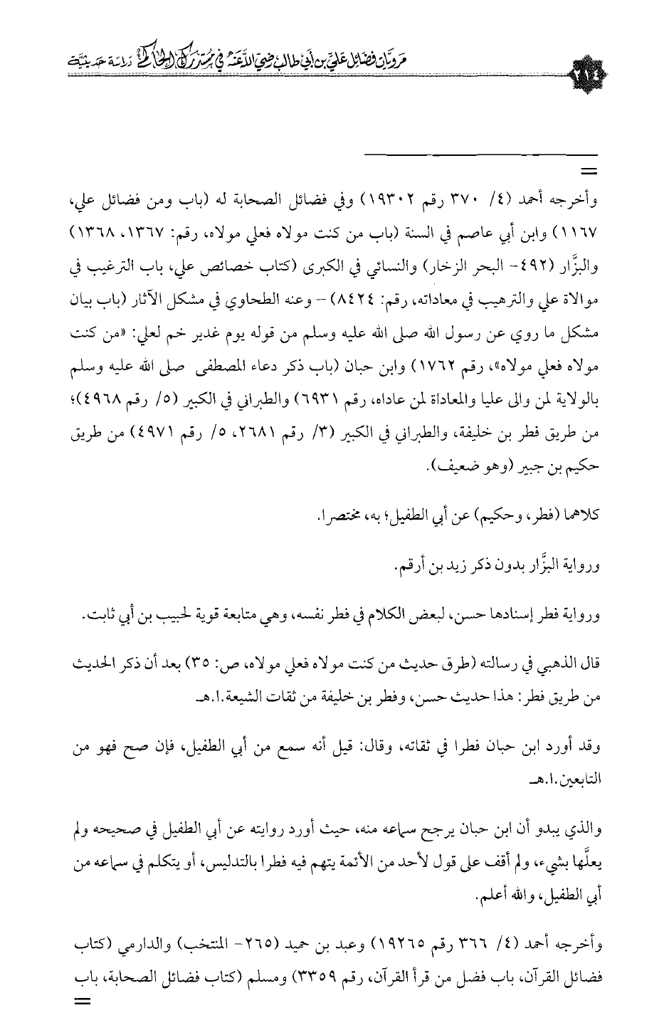 وأخرجه أحمد (٤/ ٣٧٠ رقم ١٩٣٠٢) وفي فضائل الصحابة له (باب ومن فضائل علي، ١١٦٧) وابن أبي عاصم في السنة (باب من كنت مولاه فعلي مولاه، رقم: ١٣٦٧، ١٣٦٨) والبزَّار (٤٩٢ - البحر الزخار) والنسائي في الكبرى (كتاب خصائص علي، باب الترغيب في موالاة علي والترهيب في معاداته، رقم: ٨٤٢٤) - وعنه الطحاوي في مشكل الآثار (باب بيان مشكل ما روي عن رسول الله صلى الله عليه وسلم من قوله يوم غدير خم لعلي: «من كنت مولاه فعلي مولاه»، رقم ١٧٦٢) وابن حبان (باب ذكر دعاء المصطفى صلى الله عليه وسلم بالولاية لمن والى عليا والمعاداة لمن عاداه، رقم ٦٩٣١) والطبراني في الكبير (٥/ رقم ٤٩٦٨)؛ من طريق فطر بن خليفة، والطبراني في الكبير (٣/ رقم ٢٦٨١، ٥/ رقم ٤٩٧١) من طريق حكيم بن جبير (وهو ضعيف).