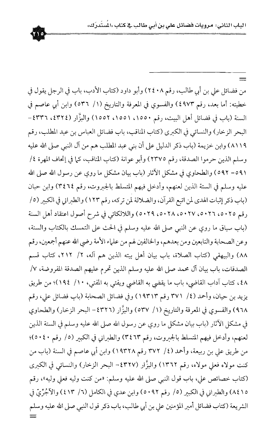 = من فضائل علي بن أبي طالب، رقم ٢٤٠٨) وأبو داود (كتاب الأدب، باب في الرجل يقول في خطبته: أما بعد، رقم ٤٩٧٣) والفسوي في المعرفة والتاريخ (١/ ٥٣٦) وابن أبي عاصم في السنة (باب في فضائل أهل البيت، رقم ١٥٥٠، ١٥٥١، ١٥٥٢) والبزَّار (٤٣٢٤، ٤٣٣٦ - البحر الزخار) والنسائي في الكبرى (كتاب المناقب، باب فضائل العباس بن عبدالمطلب، رقم ٨١١٩) وابن خزيمة (باب ذكر الدليل على أن بني عبد المطلب هم من آل النبي صلى الله عليه وسلم الذين حرموا الصدقة، رقم ٢٣٧٥) وأبو عوانة (كتاب المناقب، كما في إتحاف المهرة ٤/ ٥٩١ - ٥٩٢) والطحاوي في مشكل الآثار (باب بيان مشكل ما روي عن رسول الله صلى الله عليه وسلم في الستة الذين لعنهم، وأدخل فيهم المتسلط بالجبروت، رقم ٣٤٦٤) وابن حبان (باب ذكر إثبات الهدى لمن اتبع القرآن، والضلالة لمن تركه، رقم ١٢٣) والطبراني في الكبير (٥/ رقم ٥٠٢٥، ٥٠٢٦، ٥٠٢٧، ٥٠٢٨، ٥٠٢٩) واللالكائي في شرح أصول اعتقاد أهل السنة (باب سياق ما روي عن النبي صلى الله عليه وسلم في الحث على التمسك بالكتاب والسنة، وعن الصحابة والتابعين ومن بعدهم، والخالفين لهم من علماء الأمة رضي الله عنهم أجمعين، رقم ٨٨) والبيهقي (كتاب الصلاة، باب بيان أهل بيته الذين هم آله، ٢/ ٢١٢، كتاب قسم الصدقات، باب بيان آل محمد صلى الله عليه وسلم الذين تحرم عليهم الصدقة المفروضة، ٧/ ٤٨، كتاب آداب القاضي، باب ما يقضي به القاضي ويفتي به المفتي، ١٠/ ١٩٤)؛ من طريق يزيد بن حيان، وأحمد (٤/ ٣٧١ رقم ١٩٣١٣) وفي فضائل الصحابة (باب فضائل علي، رقم ٩٦٨) والفسوي في المعرفة والتاريخ (١/ ٥٣٧) والبزَّار (٤٣٢٦ - البحر الزخار) والطحاوي في مشكل الآثار (باب بيان مشكل ما روي عن رسول الله صلى الله عليه وسلم في الستة الذين لعنهم، وأدخل فيهم المتسلط بالجبروت، رقم ٣٤٦٣) والطبراني في الكبير (٥/ رقم ٥٠٤٠)؛ من طريق علي بن ربيعة، وأحمد (٤/ ٣٧٢ رقم ١٩٣٢٨) وابن أبي عاصم في السنة (باب من كنت مولاه فعلي مولاه، رقم ١٣٦٢) والبزَّار (٤٣٢٧ - البحر الزخار) والنسائي في الكبرى (كتاب خصائص علي، باب قول النبي صلى الله عليه وسلم: «من كنت وليه فعلي وليه»، رقم ٨٤١٥) والطبراني في الكبير (٥/ رقم ٥٠٩٢) وابن عدي في الكامل (٦/ ٤١٣) والآجُرِّيّ في الشريعة (كتاب فضائل أمير المؤمنين علي بن أبي طالب، باب ذكر قول النبي صلى الله عليه وسلم =