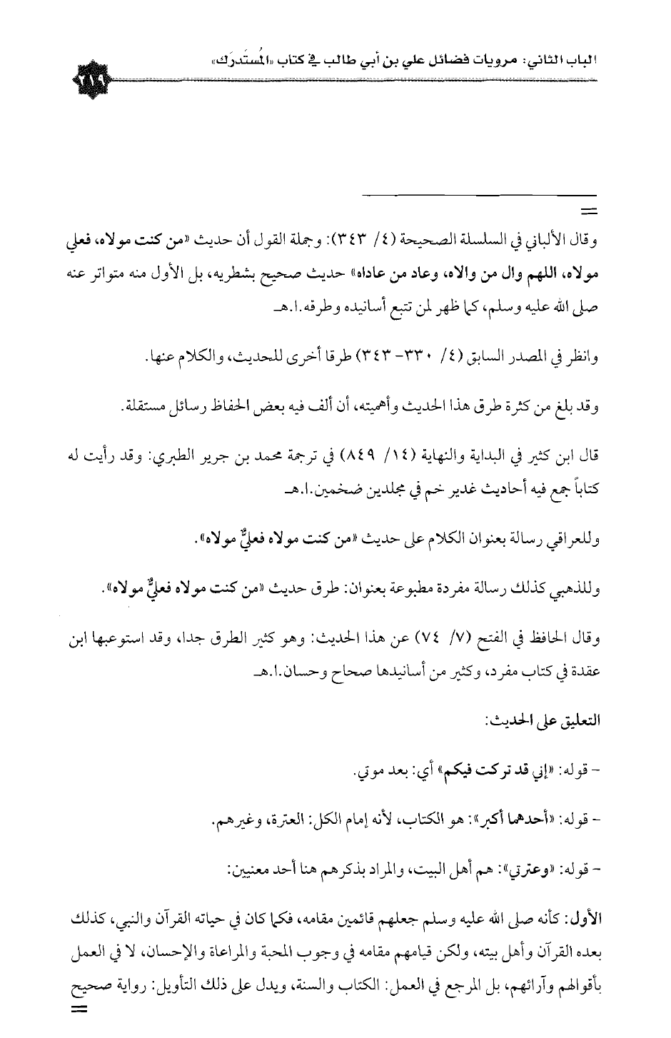 = وقال الألباني في السلسلة الصحيحة (٤/ ٣٤٣): وجملة القول أن حديث «من كنت مولاه، فعلي مولاه، اللهم وال من والاه، وعاد من عاداه» حديث صحيح بشطريه، بل الأول منه متواتر عنه صلى الله عليه وسلم، كما ظهر لمن تتبع أسانيده وطرقه. ا. هـ
