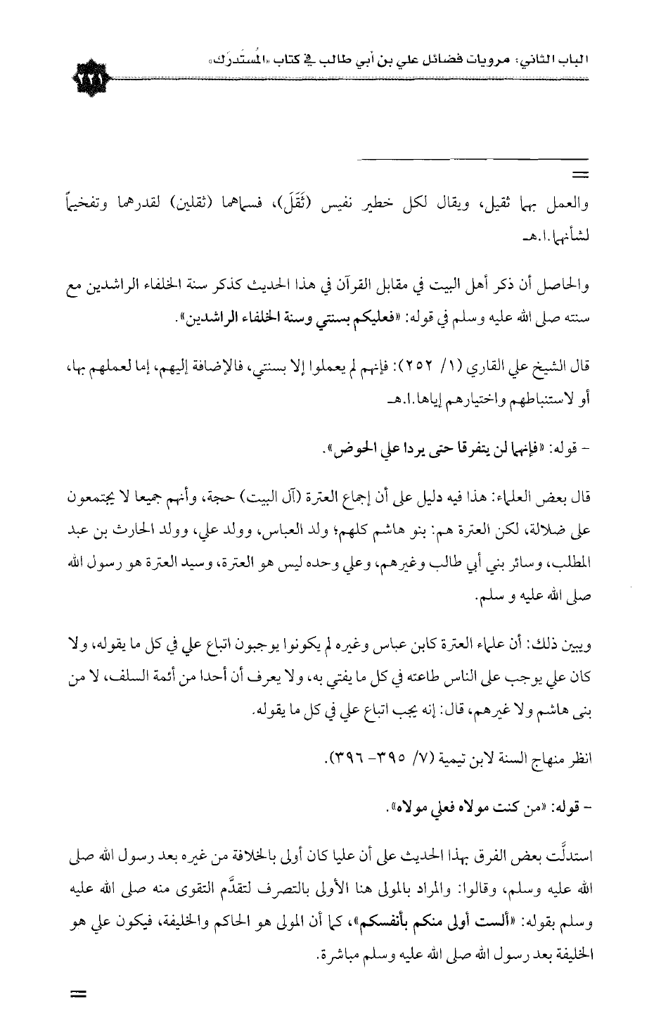 والحاصل أن ذكر أهل البيت في مقابل القرآن في هذا الحديث كذكر سنة الخلفاء الراشدين مع سنته صلى الله عليه وسلم في قوله: «فعليكم بسنتي وسنة الخلفاء الراشدين».