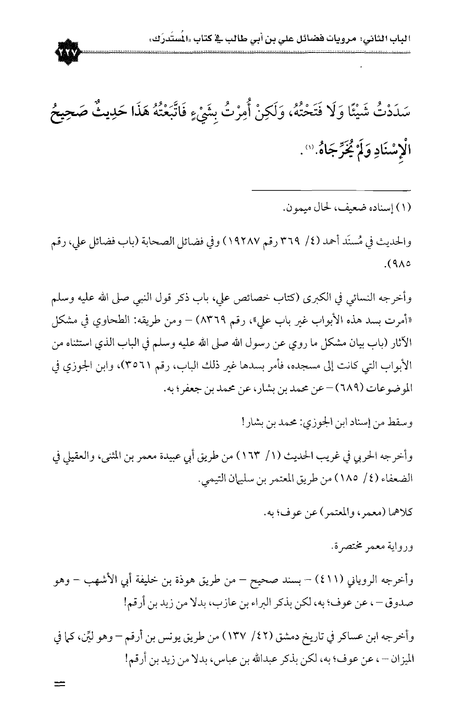 وأخرجه النسائي في الكبرى (كتاب خصائص علي، باب ذكر قول النبي صلى الله عليه وسلم «أمرت بسد هذه الأبواب غير باب علي»، رقم ٨٣٦٩) - ومن طريقه: الطحاوي في مشكل الآثار (باب بيان مشكل ما روي عن رسول الله صلى الله عليه وسلم في الباب الذي استثناه من الأبواب التي كانت إلى مسجده، فأمر بسدها غير ذلك الباب، رقم ٣٥٦١)، وابن الجوزي في الموضوعات (٦٨٩) - عن محمد بن بشار، عن محمد بن جعفر؛ به.