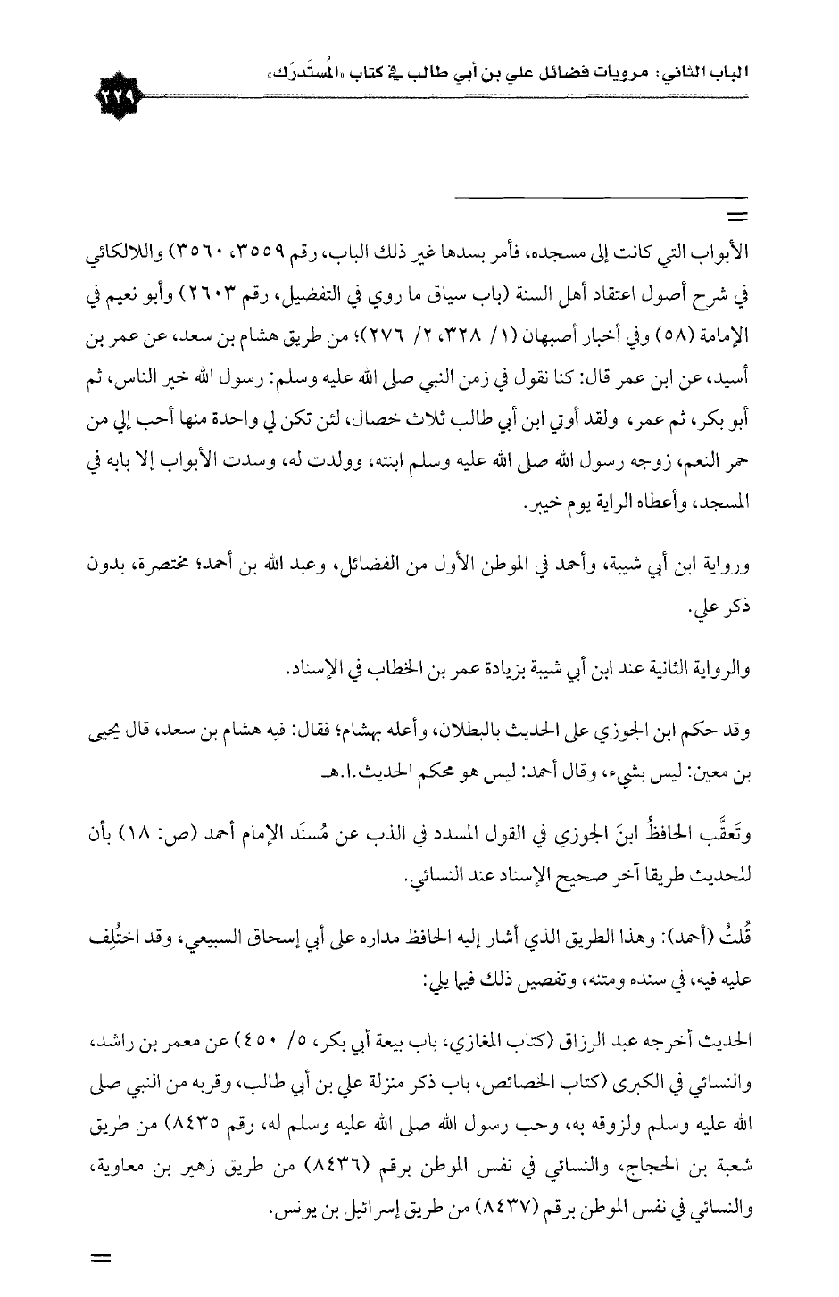 = الأبواب التي كانت إلى مسجده، فأمر بسدها غير ذلك الباب، رقم ٣٥٥٩، ٣٥٦٠) واللالكائي في شرح أصول اعتقاد أهل السنة (باب سياق ما روي في التفضيل، رقم ٢٦٠٣) وأبو نعيم في الإمامة والرد على الرافضة (٥٨) وفي أخبار أصبهان (١/ ٣٢٨، ٢/ ٢٧٦)؛ من طريق هشام بن سعد، عن عمر بن أسيد، عن ابن عمر قال: كنا نقول في زمن النبي صلى الله عليه وسلم: رسول الله خير الناس، ثم أبو بكر، ثم عمر، ولقد أوتي ابن أبي طالب ثلاث خصال، لئن تكن لي واحدة منها أحب إلي من حمر النعم، زوجه رسول الله صلى الله عليه وسلم ابنته، وولدت له، وسدت الأبواب إلا بابه في المسجد، وأعطاه الراية يوم خيبر.