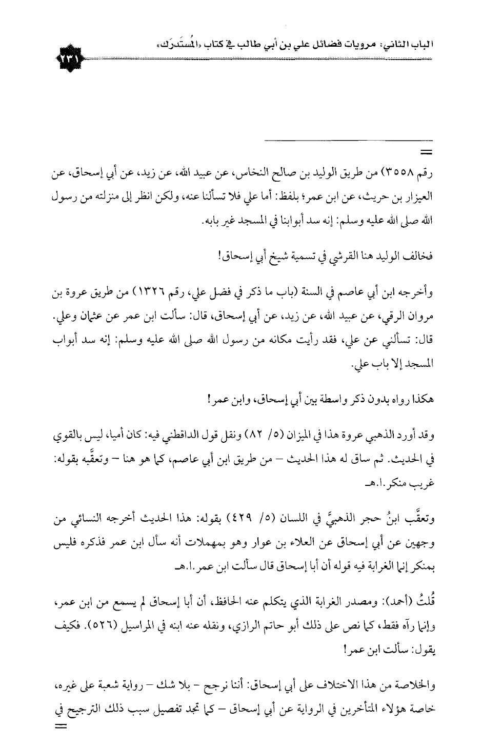 = رقم ٣٥٥٨) من طريق الوليد بن صالح النخاس، عن عبيدالله، عن زيد، عن أبي إسحاق، عن العيزار بن حريث، عن ابن عمر؛ بلفظ: أما علي فلا تسألنا عنه، ولكن انظر إلى منزلته من رسول الله صلى الله عليه وسلم: إنه سد أبوابنا في المسجد غير بابه.