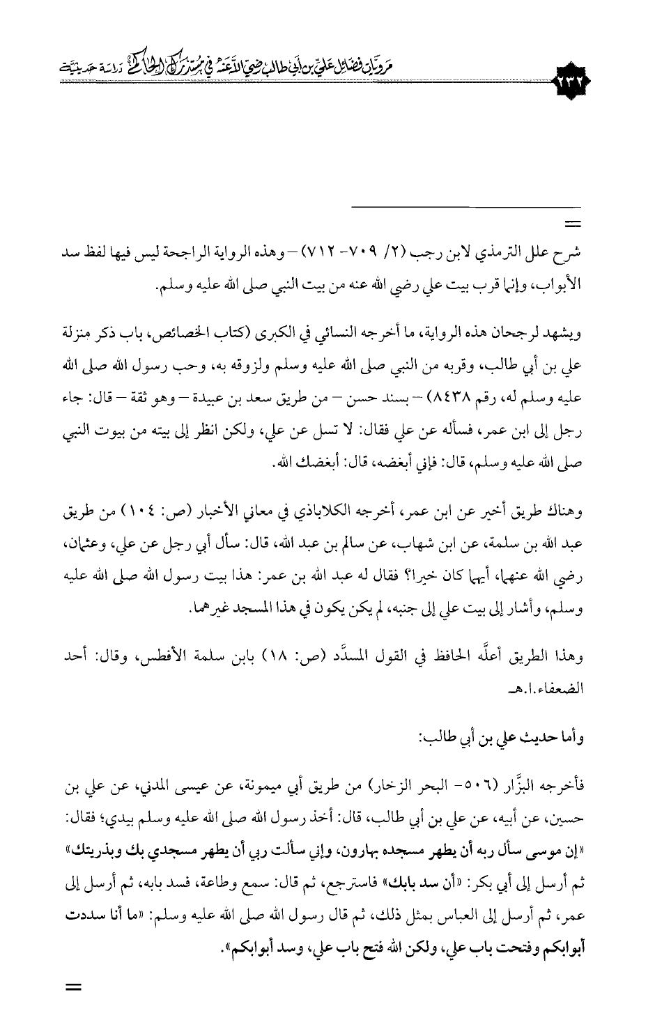 = شرح علل الترمذي لابن رجب (٢/ ٧٠٩ - ٧١٢) - وهذه الرواية الراجحة ليس فيها لفظ سد الأبواب، وإنما قرب بيت علي رضي الله عنه من بيت النبي صلى الله عليه وسلم.