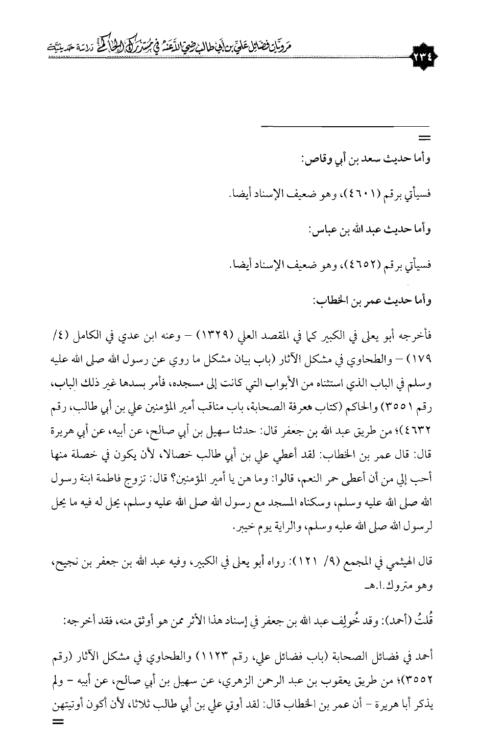 فأخرجه أبو يعلى في الكبير كما في المقصد العلي (١٣٢٩) - وعنه ابن عدي في الكامل (٤/ ١٧٩) - والطحاوي في مشكل الآثار (باب بيان مشكل ما روي عن رسول الله صلى الله عليه وسلم في الباب الذي استثناه من الأبواب التي كانت إلى مسجده، فأمر بسدها غير ذلك الباب، رقم ٣٥٥١) والحاكم (كتاب معرفة الصحابة، باب مناقب أمير المؤمنين علي بن أبي طالب، رقم ٤٦٣٢)؛ من طريق عبدالله بن جعفر قال: حدثنا سهيل بن أبي صالح، عن أبيه، عن أبي هريرة قال: قال عمر بن الخطاب: لقد أعطي علي بن أبي طالب خصالا، لأن يكون في خصلة منها أحب إلي من أن أعطى حمر النعم، قالوا: وما هن يا أمير المؤمنين؟ قال: تزوج فاطمة ابنة رسول الله صلى الله عليه وسلم، وسكناه المسجد مع رسول الله صلى الله عليه وسلم، يحل له فيه ما يحل لرسول الله صلى الله عليه وسلم، والراية يوم خيبر.