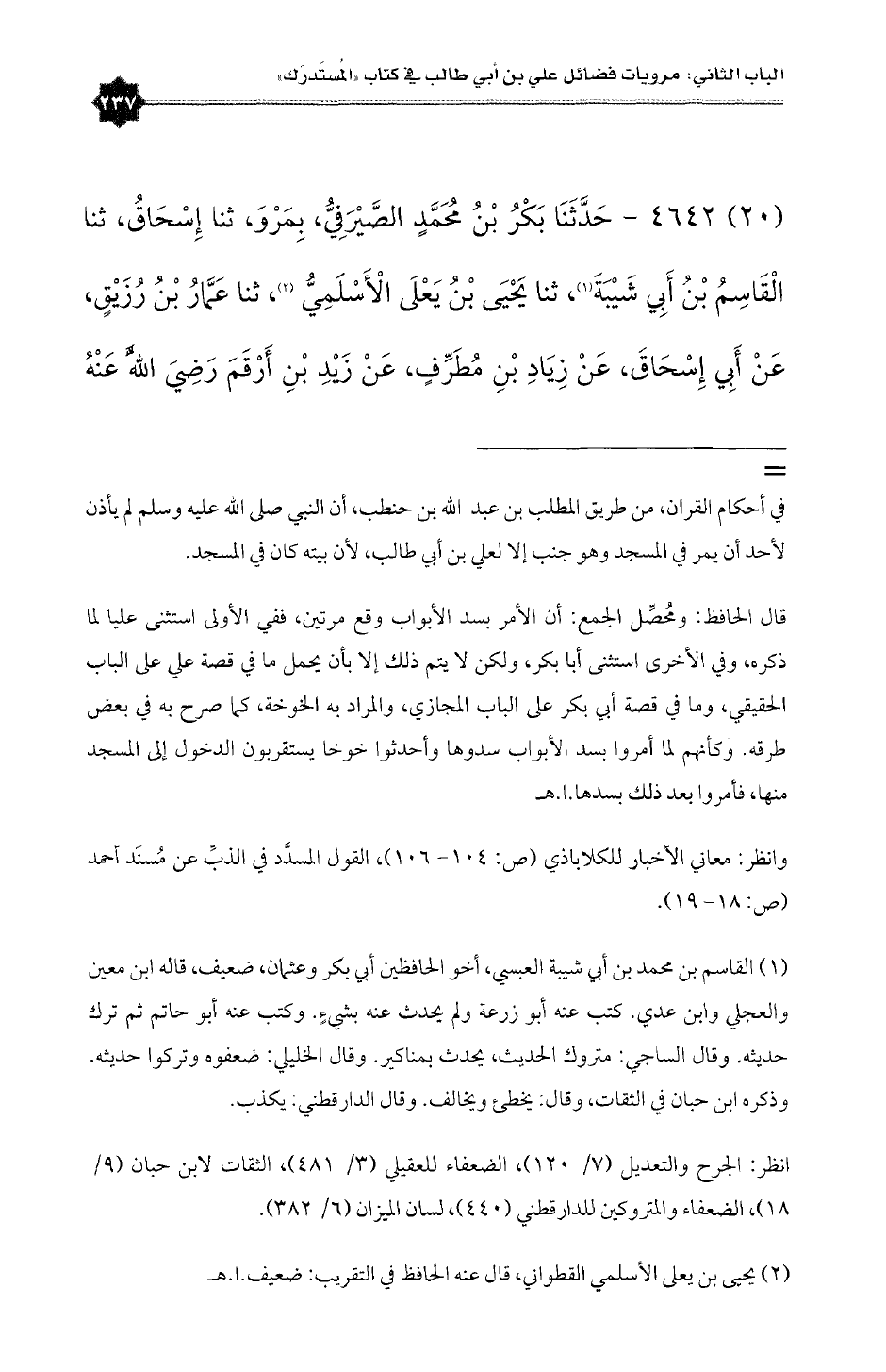 (٢٠) ٤٦٤٢ - حَدَّثَنَا بَكْرُ بْنُ مُحَمَّدٍ الصَّيْرَفِيُّ، بِمَرْوَ، ثنا إِسْحَاقُ، ثنا الْقَاسِمُ بْنُ أَبِي شَيْبَةَ (¬١)، ثنا يَحْيَى بْنُ يَعْلَى الْأَسْلَمِيُّ (¬٢)، ثنا عَمَّارُ بْنُ رُزَيْقٍ، عَنْ أَبِي إِسْحَاقَ، عَنْ زِيَادِ بْنِ مُطَرِّفٍ، عَنْ زَيْدِ بْنِ أَرْقَمَ رَضِيَ اللَّهُ عَنْهُ
