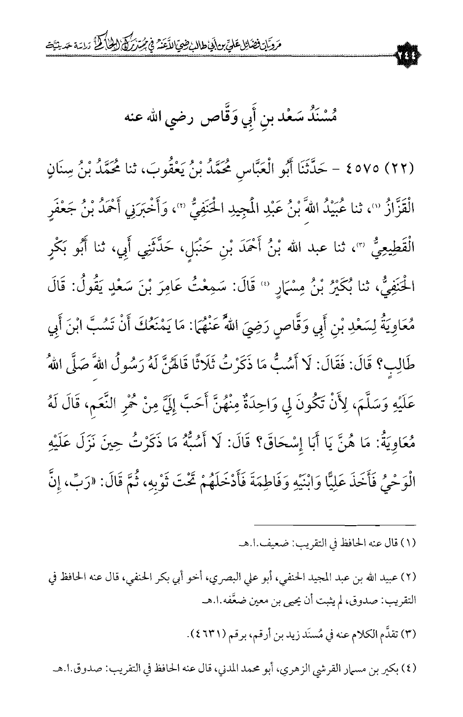 (٢٢) ٤٥٧٥ - حَدَّثَنَا أَبُو الْعَبَّاسِ مُحَمَّدُ بْنُ يَعْقُوبَ، ثنا مُحَمَّدُ بْنُ سِنَانٍ الْقَزَّازُ (¬١)، ثنا عُبَيْدُاللَّهِ بْنُ عَبْدِالْمَجِيدِ الْحَنَفِيُّ (¬٢)، وَأَخْبَرَنِي أَحْمَدُ بْنُ جَعْفَرٍ الْقَطِيعِيُّ (¬٣)، ثنا عبدالله بْنُ أَحْمَدَ بْنِ حَنْبَلٍ، حَدَّثَنِي أَبِي، ثنا أَبُو بَكْرٍ الْحَنَفِيُّ، ثنا بُكَيْرُ بْنُ مِسْمَارٍ (¬٤) قَالَ: سَمِعْتُ عَامِرَ بْنَ سَعْدٍ يَقُولُ: قَالَ مُعَاوِيَةُ لِسَعْدِ بْنِ أَبِي وَقَّاصٍ رَضِيَ اللَّهُ عَنْهُمَا: مَا يَمْنَعُكَ أَنْ تَسُبَّ ابْنَ أَبِي طَالِبٍ؟ قَالَ: فَقَالَ: لَا أَسُبُّ مَا ذَكَرْتُ ثَلَاثًا قَالَهُنَّ لَهُ رَسُولُ اللَّهِ صَلَّى اللهُ عَلَيْهِ وَسَلَّمَ، لِأَنْ تَكُونَ لِي وَاحِدَةٌ مِنْهُنَّ أَحَبَّ إِلَيَّ مِنْ حُمْرِ النَّعَمِ، قَالَ لَهُ مُعَاوِيَةُ: مَا هُنَّ يَا أَبَا إِسْحَاقَ؟ قَالَ: لَا أَسُبُّهُ مَا ذَكَرْتُ حِينَ نَزَلَ عَلَيْهِ الْوَحْيُ فَأَخَذَ عَلِيًّا وَابْنَيْهِ وَفَاطِمَةَ فَأَدْخَلَهُمْ تَحْتَ ثَوْبِهِ، ثُمَّ قَالَ: «رَبِّ، إِنَّ
