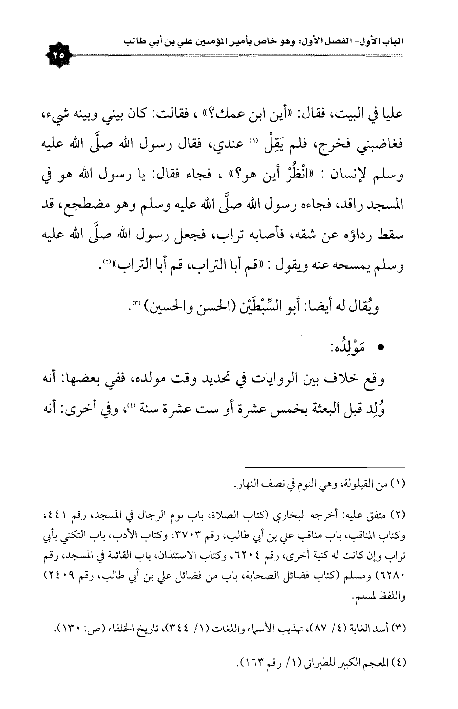 (¬٢) متفق عليه: أخرجه البخاري (كتاب الصلاة، باب نوم الرجال في المسجد، رقم ٤٤١، وكتاب المناقب، باب مناقب علي بن أبي طالب، رقم ٣٧٠٣، وكتاب الأدب، باب التكني بأبي تراب وإن كانت له كنية أخرى، رقم ٦٢٠٤، وكتاب الاستئذان، باب القائلة في المسجد، رقم ٦٢٨٠) ومسلم (كتاب فضائل الصحابة، باب من فضائل علي بن أبي طالب، رقم ٢٤٠٩) واللفظ لمسلم.