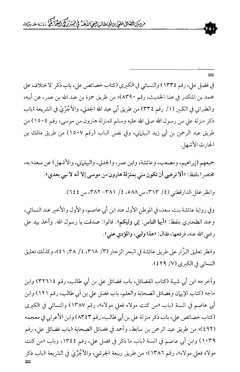 = في فضل علي، رقم ١٣٣٤) والنسائي في الكبرى (كتاب خصائص علي، باب ذكر الاختلاف على محمد بن المنكدر في هذا الحديث، رقم ٨٣٩٠)؛ من طريق حمزة بن عبدالله بن عمر، عن أبيه، والطبراني في الكبير (١/ رقم ٣٣٤) من طريق أبي عبدالله الجدلي، والآجُرِّيّ في الشريعة (باب ذكر منزلة علي من رسول الله صلى الله عليه وسلم كمنزلة هارون من موسى، رقم ١٥٠٤) من طريق عبدالرحمن بن أبي زيد البيلماني، وفي نفس الباب (رقم ١٥٠٧) من طريق مالك بن الحارث الأشهل.