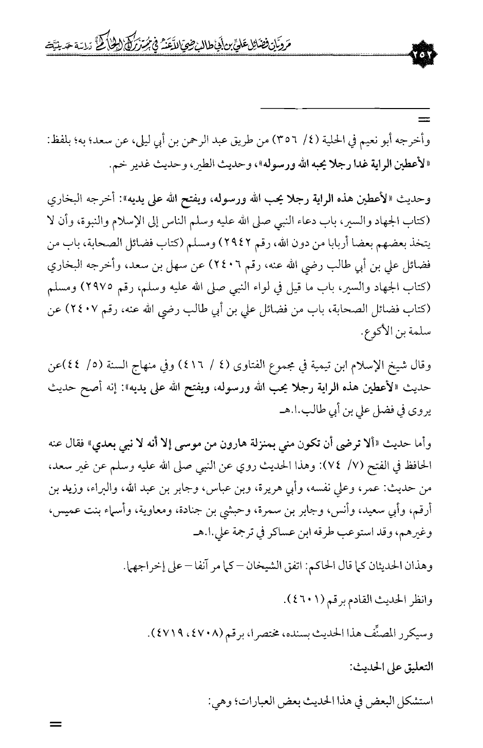 وحديث «لأعطين هذه الراية رجلا يحب الله ورسوله، ويفتح الله على يديه»: أخرجه البخاري (كتاب الجهاد والسير، باب دعاء النبي صلى الله عليه وسلم الناس إلى الإسلام والنبوة، وأن لا يتخذ بعضهم بعضا أربابا من دون الله، رقم ٢٩٤٢) ومسلم (كتاب فضائل الصحابة، باب من فضائل علي بن أبي طالب رضي الله عنه، رقم ٢٤٠٦) عن سهل بن سعد، وأخرجه البخاري (كتاب الجهاد والسير، باب ما قيل في لواء النبي صلى الله عليه وسلم، رقم ٢٩٧٥) ومسلم (كتاب فضائل الصحابة، باب من فضائل علي بن أبي طالب رضي الله عنه، رقم ٢٤٠٧) عن سلمة بن الأكوع.