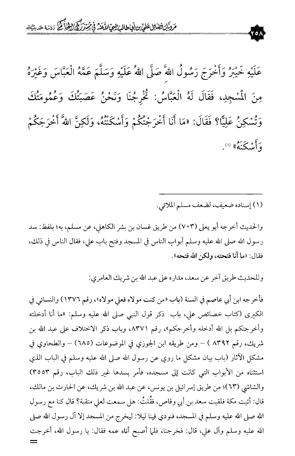 فأخرجه ابن أبي عاصم في السنة (باب «من كنت مولاه فعلي مولاه»، رقم ١٣٧٦) والنسائي في الكبرى (كتاب خصائص علي، باب ذكر قول النبي صلى الله عليه وسلم: «ما أنا أدخلته وأخرجتكم بل الله أدخله وأخرجكم»، رقم ٨٣٧١، وباب ذكر الاختلاف على عبدالله بن شريك، رقم ٨٣٩٢) - ومن طريقه ابن الجوزي في الموضوعات (٦٨٥) - والطحاوي في مشكل الآثار (باب بيان مشكل ما روي عن رسول الله صلى الله عليه وسلم في الباب الذي استثناه من الأبواب التي كانت إلى مسجده، فأمر بسدها غير ذلك الباب، رقم ٣٥٥٣) والشاشي (٦٣)؛ من طريق إسرائيل بن يونس، عن عبدالله بن شريك، عن الحارث بن مالك، قال: أتيت مكة فلقيت سعد بن أبي وقاص، فقُلتُ: هل سمعت لعلي منقبة؟ قال كنا مع رسول الله صلى الله عليه وسلم في المسجد، فنودي فينا ليلا: ليخرج من المسجد إلا آل رسول الله صلى الله عليه وسلم وآل علي، قال: فخرجنا، فلما أصبح أتاه عمه فقال: يا رسول الله، أخرجت =
