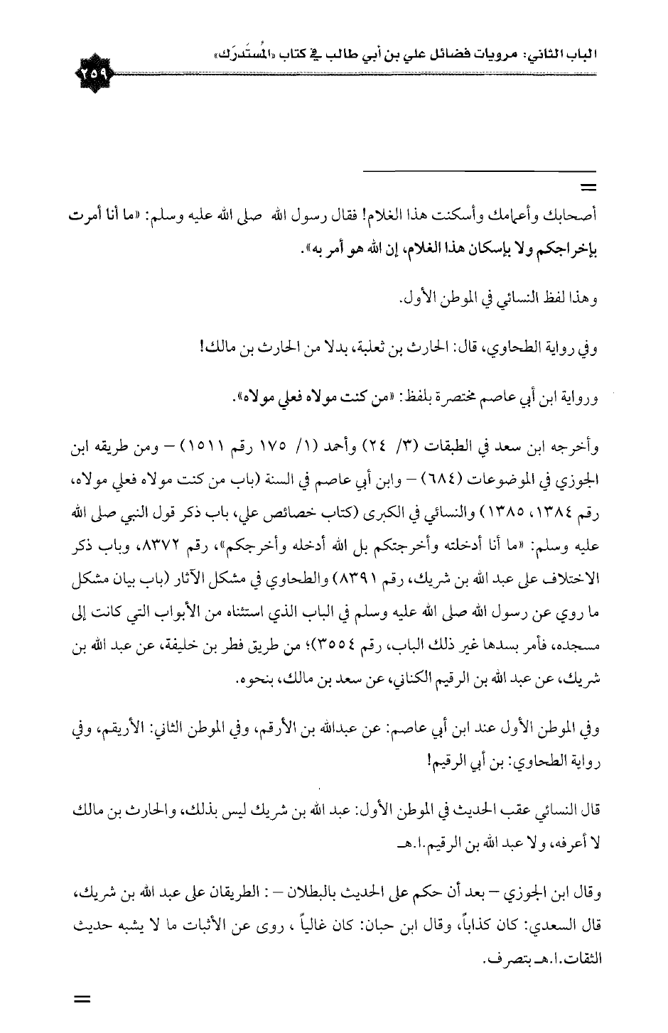 وأخرجه ابن سعد في الطبقات (٣/ ٢٤) وأحمد (١/ ١٧٥ رقم ١٥١١) - ومن طريقه ابن الجوزي في الموضوعات (٦٨٤) - وابن أبي عاصم في السنة (باب من كنت مولاه فعلي مولاه، رقم ١٣٨٤، ١٣٨٥) والنسائي في الكبرى (كتاب خصائص علي، باب ذكر قول النبي صلى الله عليه وسلم: «ما أنا أدخلته وأخرجتكم بل الله أدخله وأخرجكم»، رقم ٨٣٧٢، وباب ذكر الاختلاف على عبدالله بن شريك، رقم ٨٣٩١) والطحاوي في مشكل الآثار (باب بيان مشكل ما روي عن رسول الله صلى الله عليه وسلم في الباب الذي استثناه من الأبواب التي كانت إلى مسجده، فأمر بسدها غير ذلك الباب، رقم ٣٥٥٤)؛ من طريق فطر بن خليفة، عن عبدالله بن شريك، عن عبدالله بن الرقيم الكناني، عن سعد بن مالك، بنحوه.