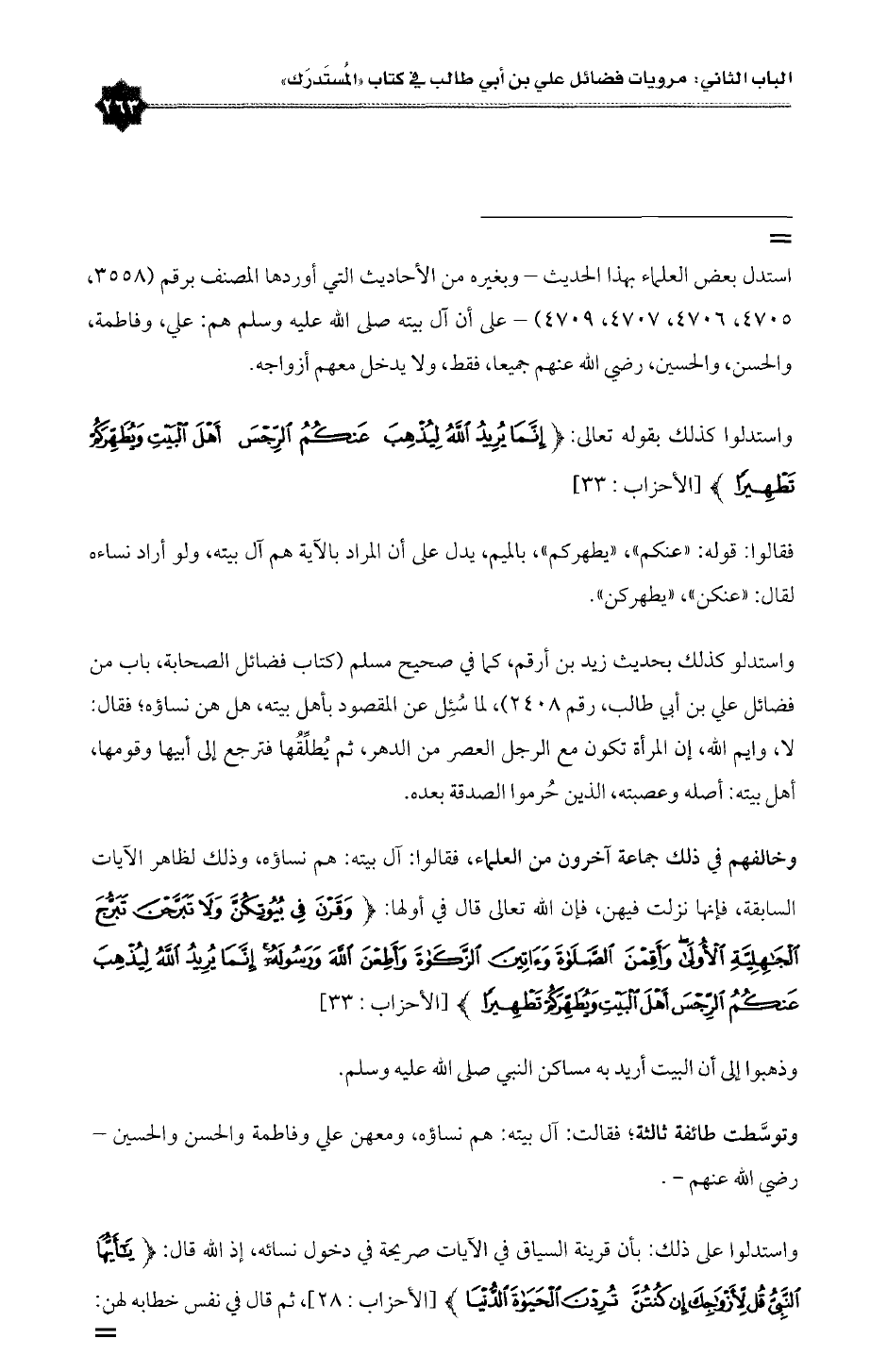 واستدلوا كذلك بقوله تعالى: {إِنَّمَا يُرِيدُ اللَّهُ لِيُذْهِبَ عَنْكُمُ الرِّجْسَ أَهْلَ الْبَيْتِ وَيُطَهِّرَكُمْ تَطْهِيرًا} [الأحزاب: ٣٣]