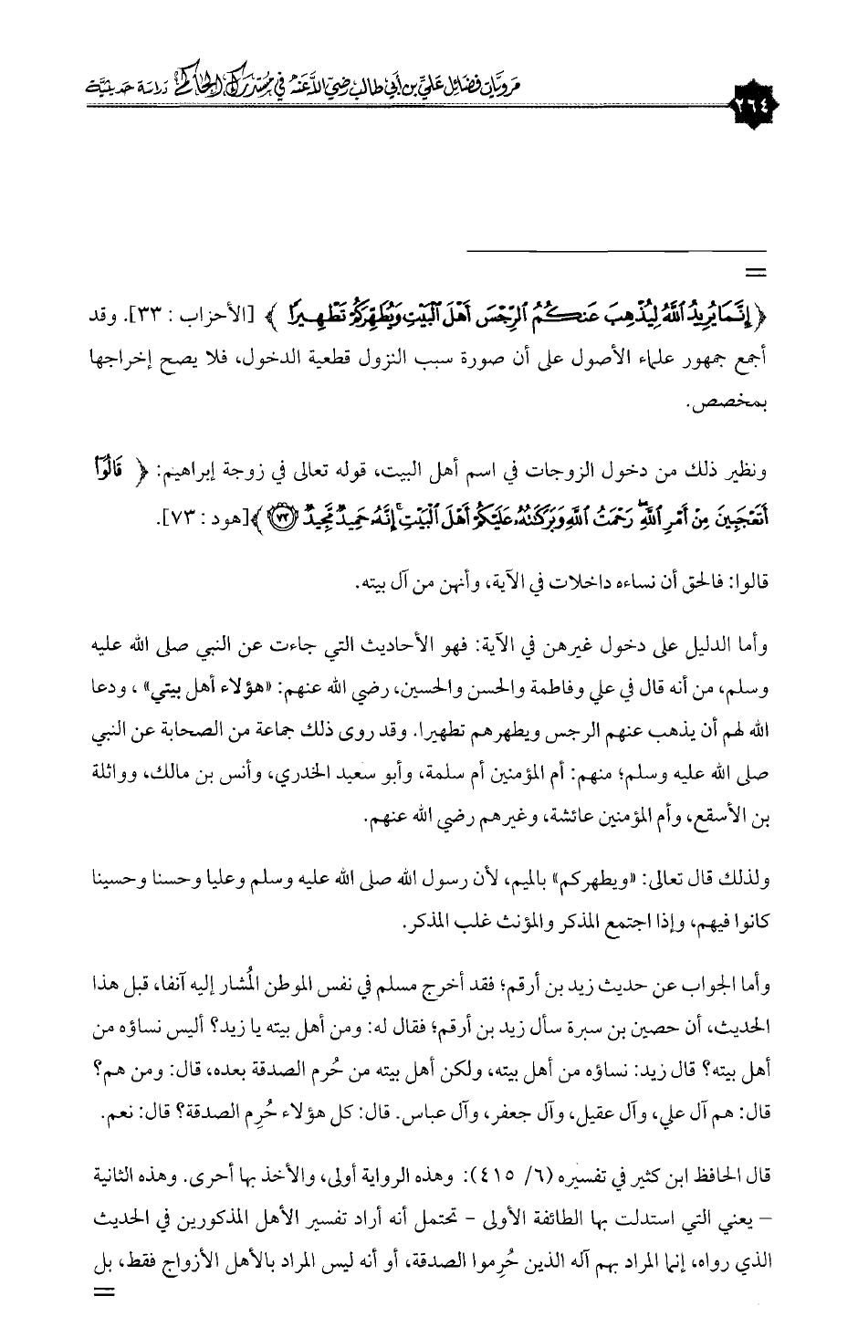 وأما الدليل على دخول غيرهن في الآية: فهو الأحاديث التي جاءت عن النبي صلى الله عليه وسلم، من أنه قال في علي وفاطمة والحسن والحسين، رضي الله عنهم: «هؤلاء أهل بيتي»، ودعا الله لهم أن يذهب عنهم الرجس ويطهرهم تطهيرا. وقد روى ذلك جماعة من الصحابة عن النبي صلى الله عليه وسلم؛ منهم: أم المؤمنين أم سلمة، وأبو سعيد الخدري، وأنس بن مالك، وواثلة بن الأسقع، وأم المؤمنين عائشة، وغيرهم رضي الله عنهم.