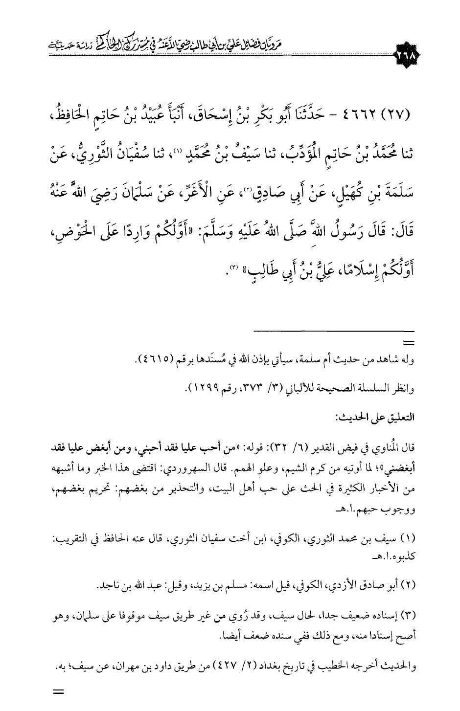 (٢٧) ٤٦٦٢ - حَدَّثَنَا أَبُو بَكْرِ بْنُ إِسْحَاقَ، أَنْبَأَ عُبَيْدُ بْنُ حَاتِمٍ الْحَافِظُ، ثنا مُحَمَّدُ بْنُ حَاتِمٍ الْمُؤَدِّبُ، ثنا سَيْفُ بْنُ مُحَمَّدٍ (¬١)، ثنا سُفْيَانُ الثَّوْرِيُّ، عَنْ سَلَمَةَ بْنِ كُهَيْلٍ، عَنْ أَبِي صَادِقٍ (¬٢)، عَنِ الْأَغَرِّ، عَنْ سَلْمَانَ رَضِيَ اللَّهُ عَنْهُ قَالَ: قَالَ رَسُولُ اللَّهِ صَلَّى اللهُ عَلَيْهِ وَسَلَّمَ: «أَوَّلُكُمْ وَارِدًا عَلَى الْحَوْضِ، أَوَّلُكُمْ إِسْلَامًا، عَلِيُّ بْنُ أَبِي طَالِبٍ» (¬٣).