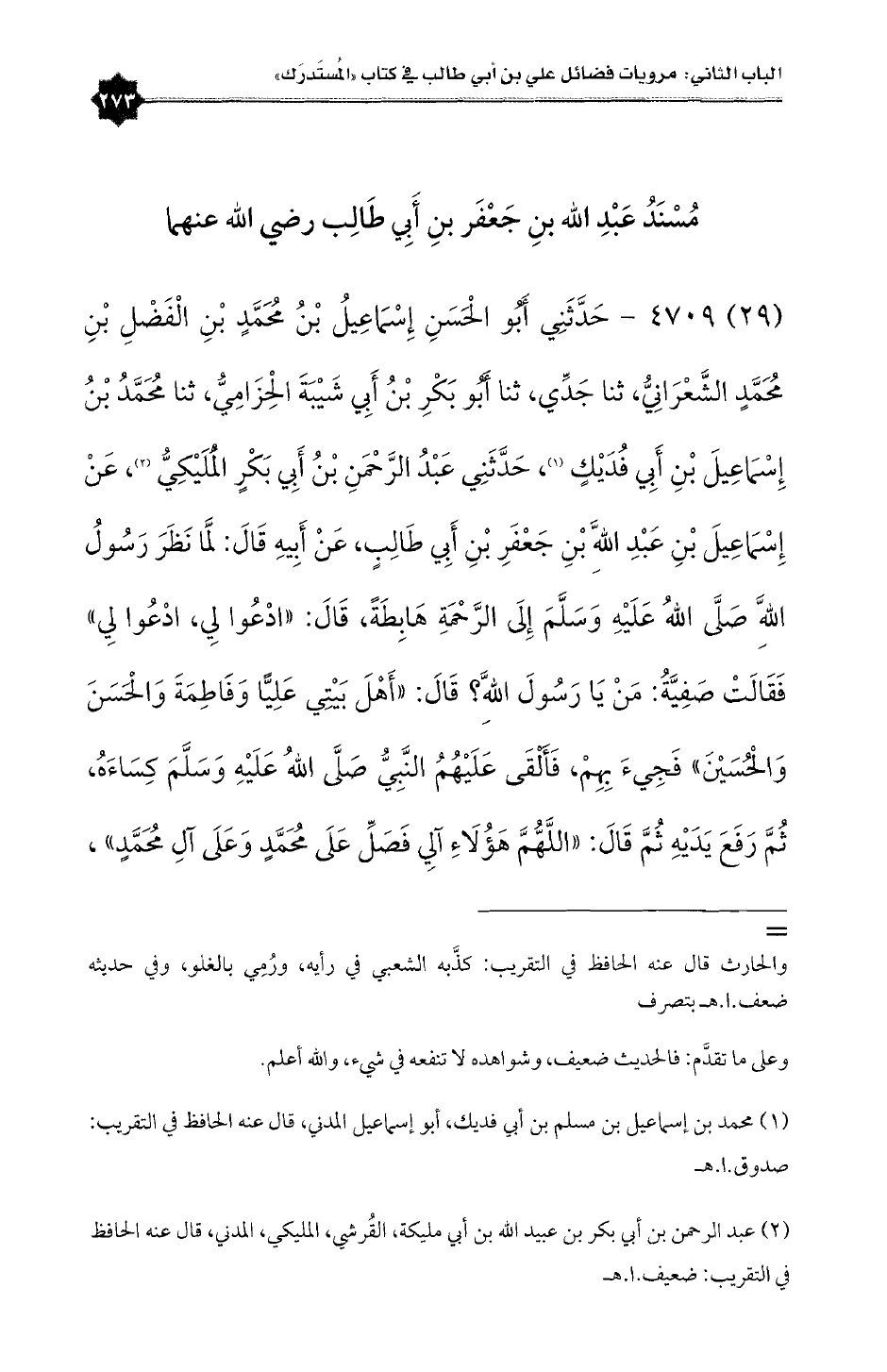 (٢٩) ٤٧٠٩ - حَدَّثَنِي أَبُو الْحَسَنِ إِسْمَاعِيلُ بْنُ مُحَمَّدٍ الْفَضْلُ بْنُ مُحَمَّدٍ الشَّعْرَانِيُّ، ثنا جَدِّي، ثنا أَبُو بَكْرِ بْنُ أَبِي شَيْبَةَ الْحِزَامِيُّ، ثنا مُحَمَّدُ بْنُ إِسْمَاعِيلَ بْنِ أَبِي فُدَيْكٍ (¬١)، حَدَّثَنِي عَبْدُالرَّحْمَنِ بْنُ أَبِي بَكْرٍ الْمُلَيْكِيُّ (¬٢)، عَنْ إِسْمَاعِيلَ بْنِ عَبْدِاللَّهِ بْنِ جَعْفَرِ بْنِ أَبِي طَالِبٍ، عَنْ أَبِيهِ قَالَ: لَمَّا نَظَرَ رَسُولُ اللَّهِ صَلَّى اللهُ عَلَيْهِ وَسَلَّمَ إِلَى الرَّحْمَةِ هَابِطَةً، قَالَ: «ادْعُوا لِي، ادْعُوا لِي» فَقَالَتْ صَفِيَّةُ: مَنْ يَا رَسُولَ اللَّهِ؟ قَالَ: «أَهْلَ بَيْتِي عَلِيًّا وَفَاطِمَةَ وَالْحَسَنَ وَالْحُسَيْنَ» فَجِيءَ بِهِمْ، فَأَلْقَى عَلَيْهُمُ النَّبِيُّ صَلَّى اللهُ عَلَيْهِ وَسَلَّمَ كِسَاءَهُ، ثُمَّ رَفَعَ يَدَيْهِ ثُمَّ قَالَ: «اللَّهُّمَّ هَؤُلَاءِ آلِي فَصَلِّ عَلَى مُحَمَّدٍ وَعَلَى آلِ مُحَمَّدٍ»،
