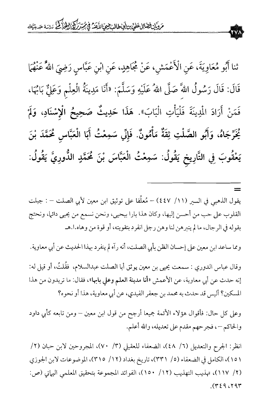 وقال عباس الدورى: سمعت يحيى بن معين يوثق أبا الصلت عبدالسلام، فقُلتُ، أو قيل له: إنه حدث عن أبى معاوية، عن الأعمش «أنا مدينة العلم وعلى بابها»، فقال: ما تريدون من هذا المسكين؟ أليس قد حدث به محمد بن جعفر الفيدى، عن أبى معاوية، هذا أو نحوه؟