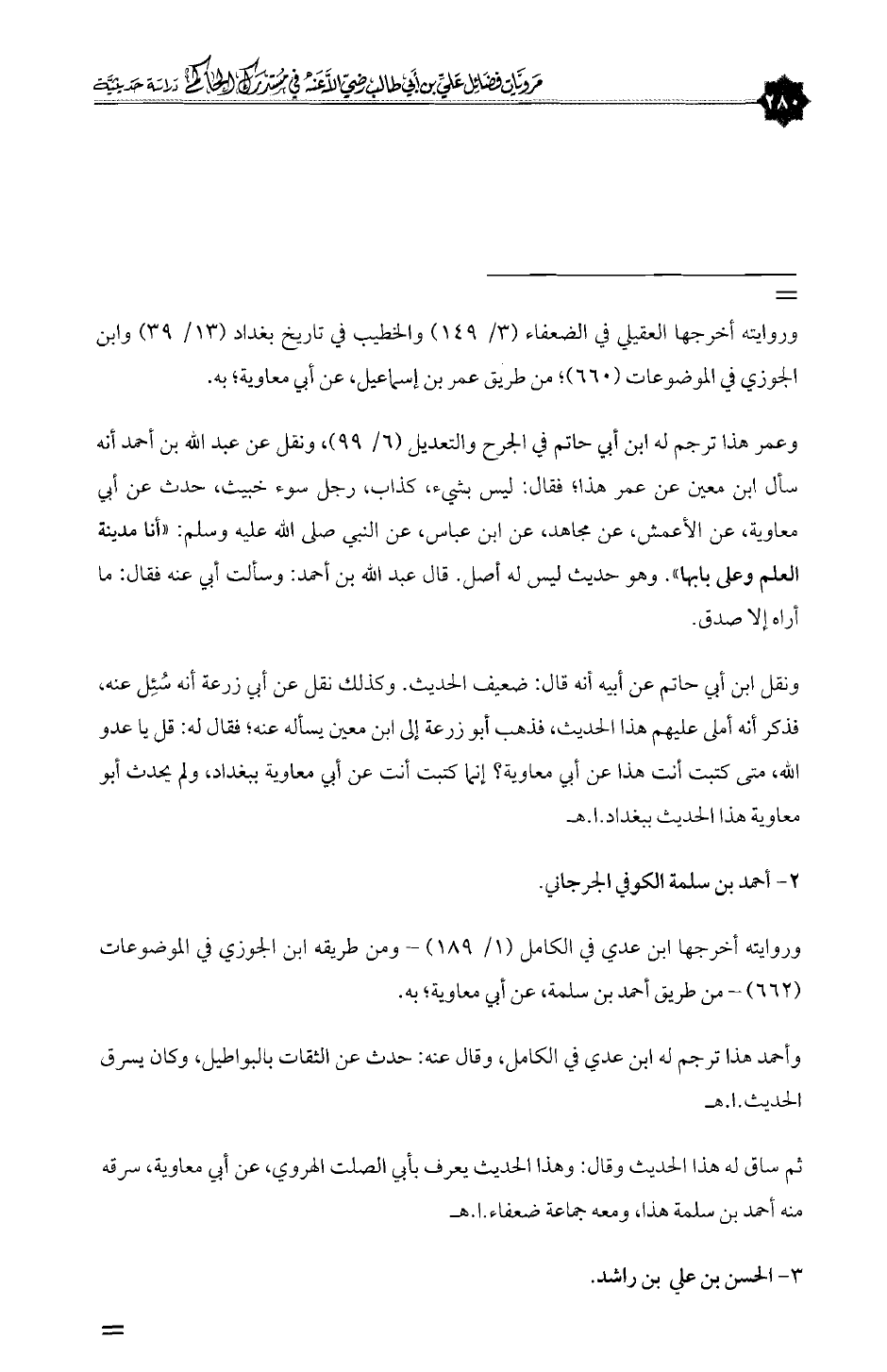 وعمر هذا ترجم له ابن أبي حاتم في الجرح والتعديل (٦/ ٩٩)، ونقل عن عبدالله بن أحمد أنه سأل ابن معين عن عمر هذا؛ فقال: ليس بشيء، كذاب، رجل سوء خبيث، حدث عن أبى معاوية، عن الأعمش، عن مجاهد، عن ابن عباس، عن النبي صلى الله عليه وسلم: «أنا مدينة العلم وعلى بابها». وهو حديث ليس له أصل. قال عبدالله بن أحمد: وسألت أبى عنه فقال: ما أراه إلا صدق.