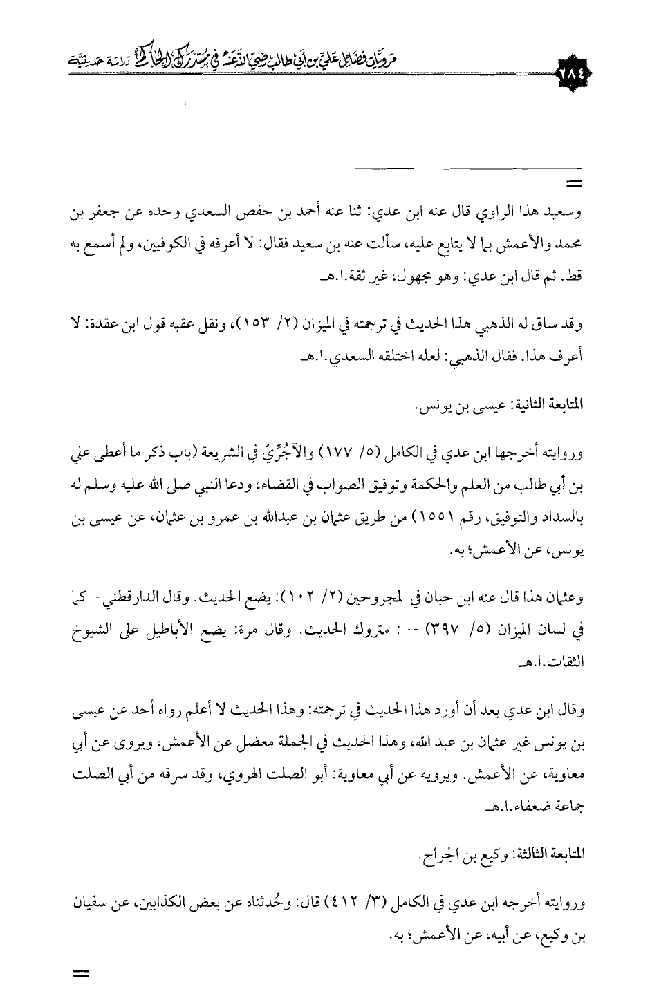 وقال ابن عدي بعد أن أورد هذا الحديث في ترجمته: وهذا الحديث لا أعلم رواه أحد عن عيسى بن يونس غير عثمان بن عبدالله، وهذا الحديث في الجملة معضل عن الأعمش، ويروى عن أبي معاوية، عن الأعمش. ويرويه عن أبي معاوية: أبو الصلت الهروي، وقد سرقه من أبي الصلت جماعة ضعفاء. ا. هـ