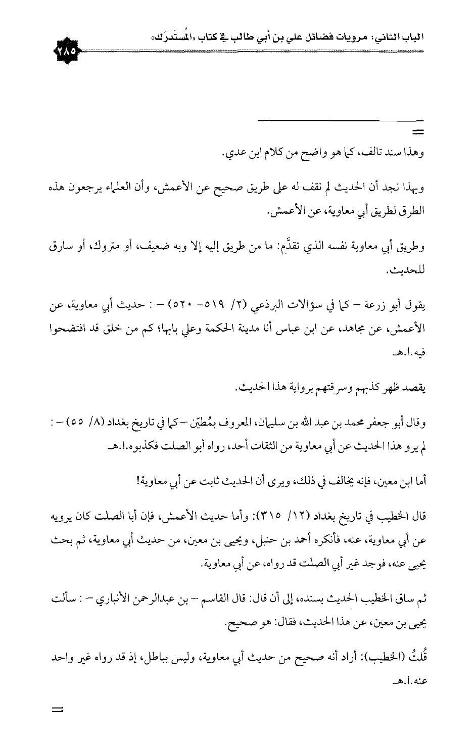 وقال أبو جعفر محمد بن عبدالله بن سليمان، المعروف بمُطيّن - كما في تاريخ بغداد (٨/ ٥٥) -: لم يرو هذا الحديث عن أبي معاوية من الثقات أحد، رواه أبو الصلت فكذبوه. ا. هـ