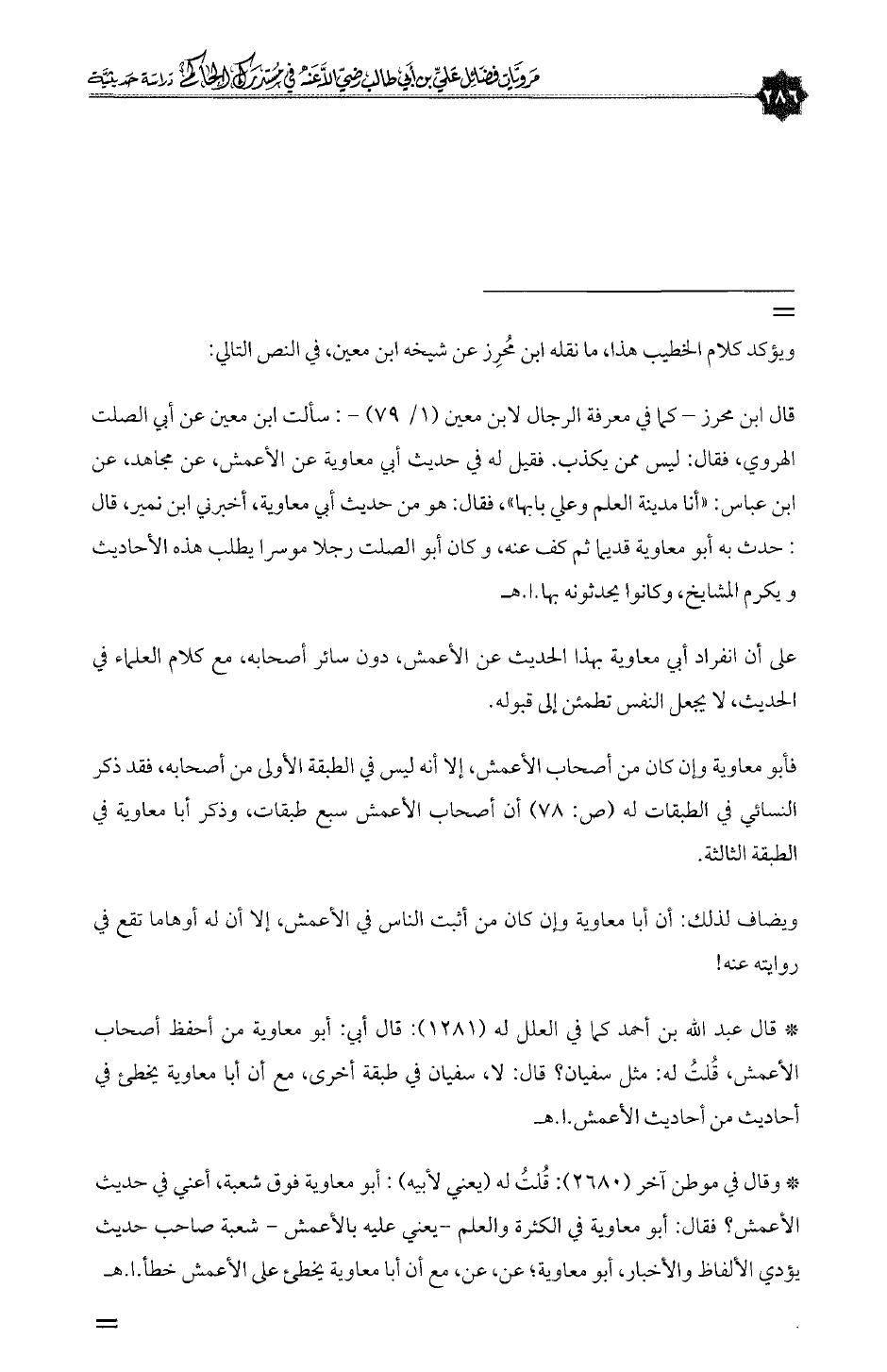 * وقال في موطن آخر (٢٦٨٠): قُلتُ له (يعني لأبيه): أبو معاوية فوق شعبة، أعني في حديث الأعمش؟ فقال: أبو معاوية في الكثرة والعلم -يعني عليه بالأعمش - شعبة صاحب حديث يؤدي الألفاظ والأخبار، أبو معاوية؛ عن، عن، مع أن أبا معاوية يخطئ على الأعمش خطأ. ا. هـ =