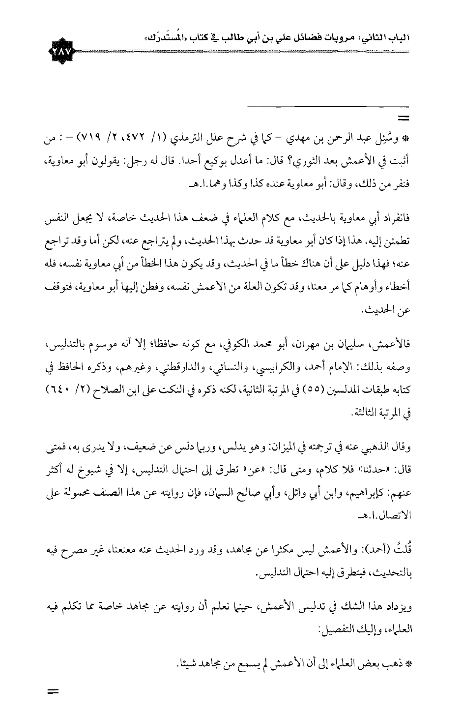 وقال الذهبي عنه في ترجمته في الميزان: وهو يدلس، وربما دلس عن ضعيف، ولا يدرى به، فمتى قال: «حدثنا» فلا كلام، ومتى قال: «عن» تطرق إلى احتمال التدليس، إلا في شيوخ له أكثر عنهم: كإبراهيم، وابن أبي وائل، وأبي صالح السمان، فإن روايته عن هذا الصنف محمولة على الاتصال. ا. هـ